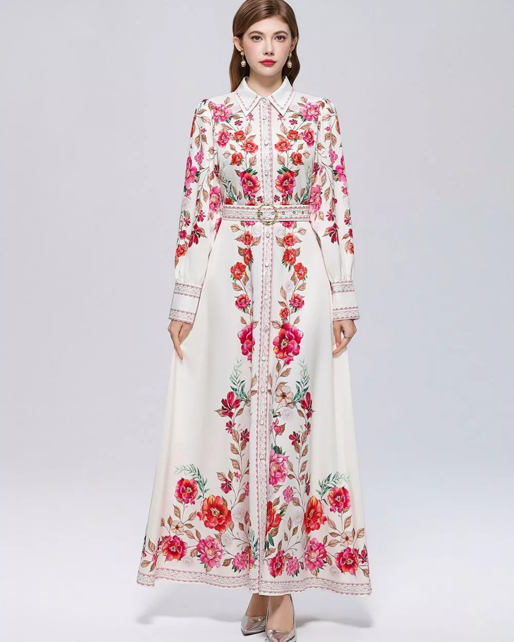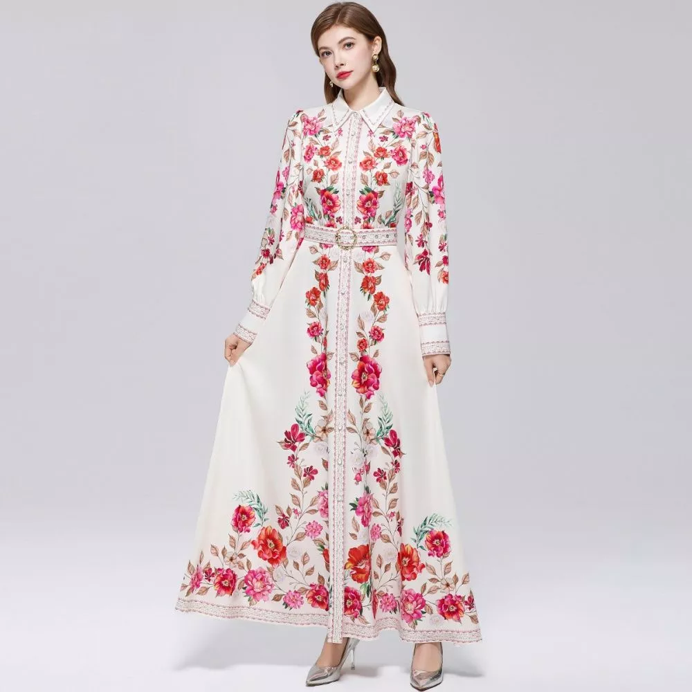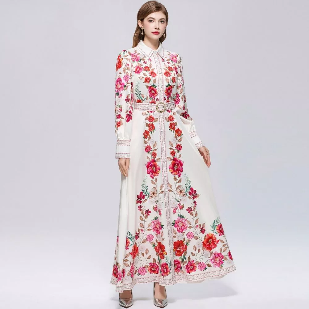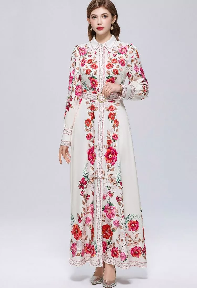 Abito Lungo Donna Floreale Bianco Rosso Elegante Collo Camicia e Cintura CF70540