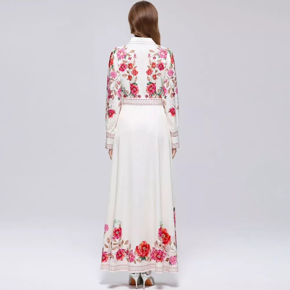 Abito lungo da donna con base bianca e stampa floreale nei toni del rosso e rosa, progettato per creare un impatto visivo più deciso rispetto alle varianti floreali più leggere. Il contrasto tra fondo neutro e motivi floreali intensi rende il capo immediatamente riconoscibile.
