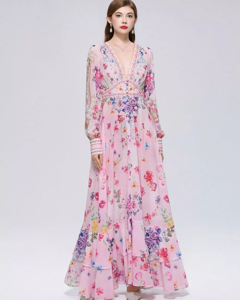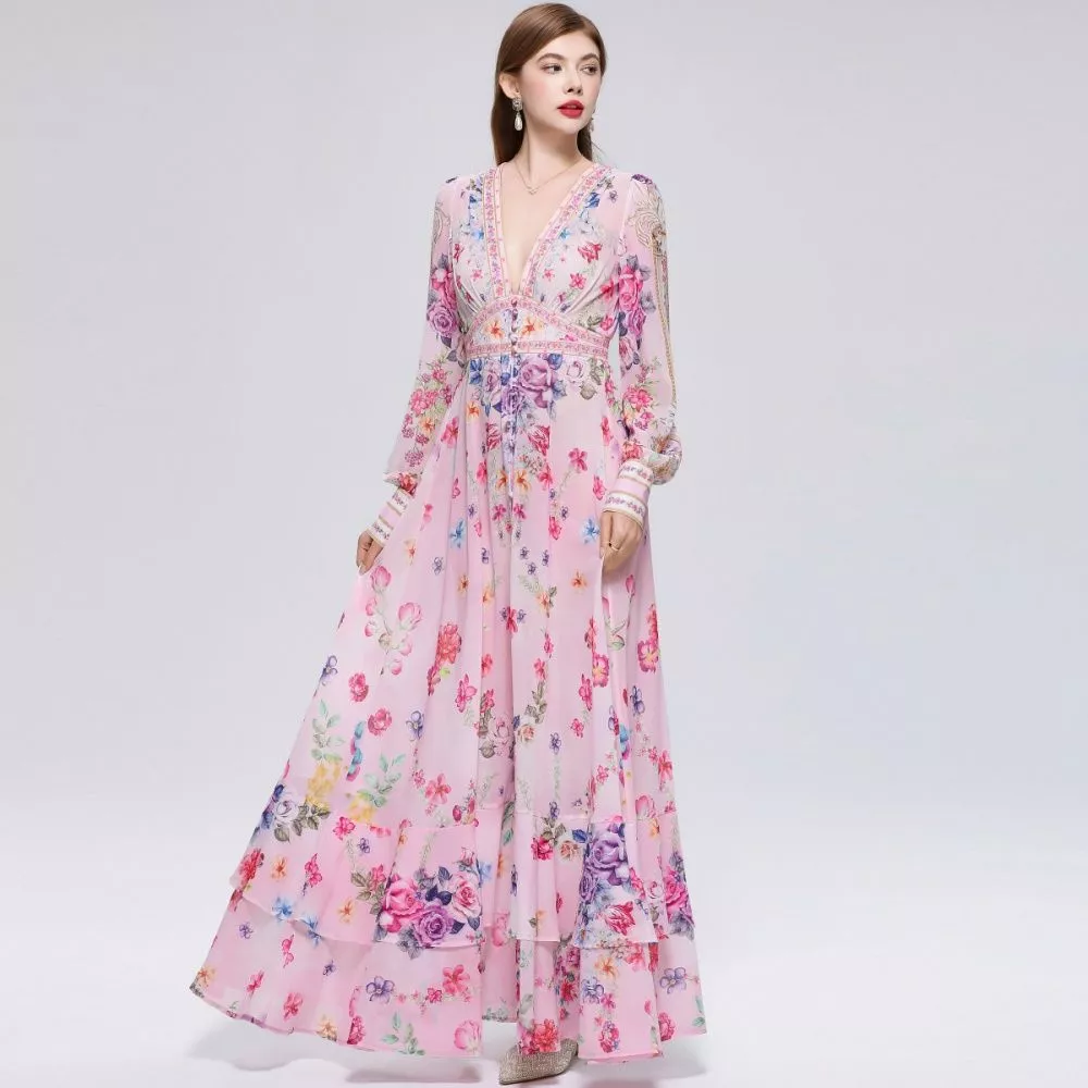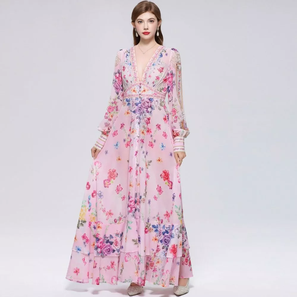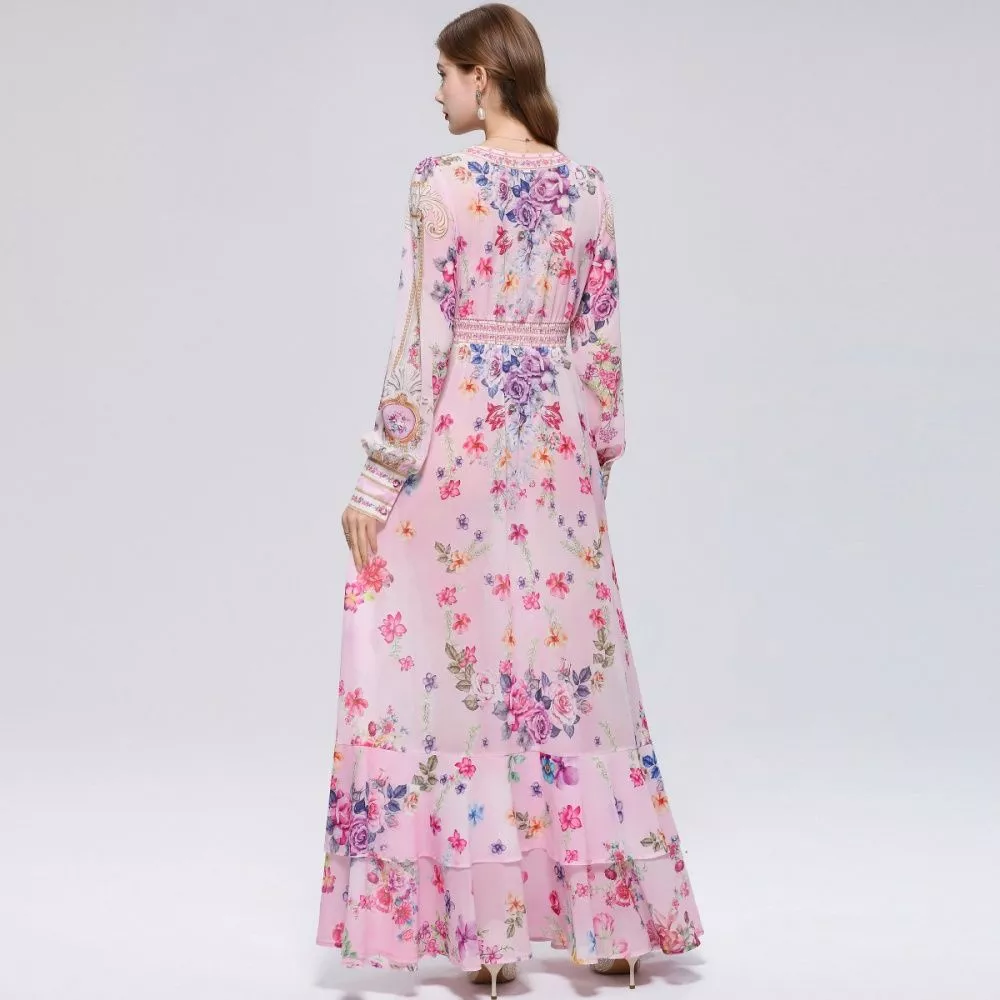 Abito lungo da donna con stampa floreale su base rosa, progettato per creare un’estetica femminile marcata e visivamente armoniosa. La tonalità principale, unita alla distribuzione diffusa dei motivi floreali, genera un effetto delicato ma evidente, con forte impatto visivo.