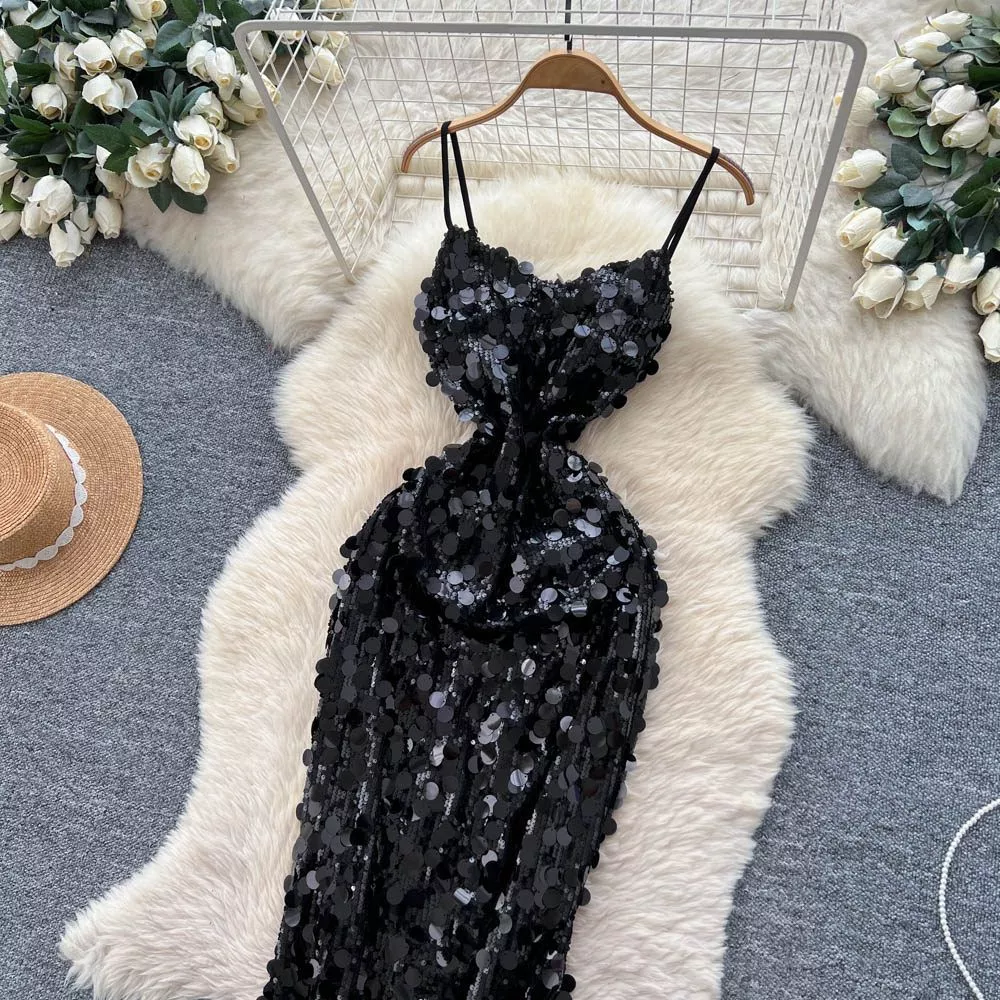 La superficie interamente decorata da paillettes di grande dimensione crea un impatto visivo luminoso e dinamico, mentre la linea aderente valorizza la silhouette.