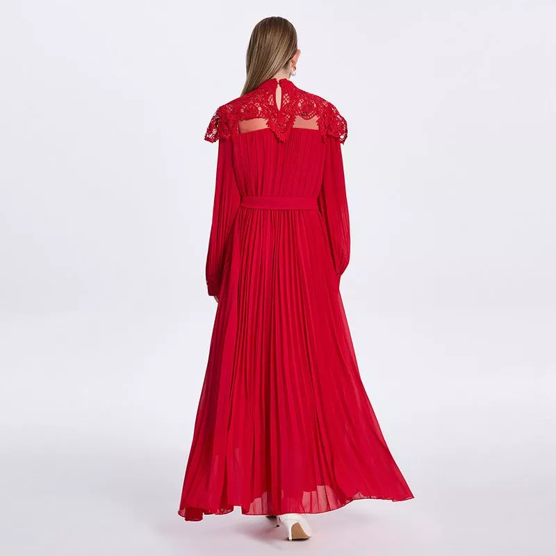 Abito Lungo Donna Rosso Plissettato Elegante Con Pizzo E Vita Segnata CF64033