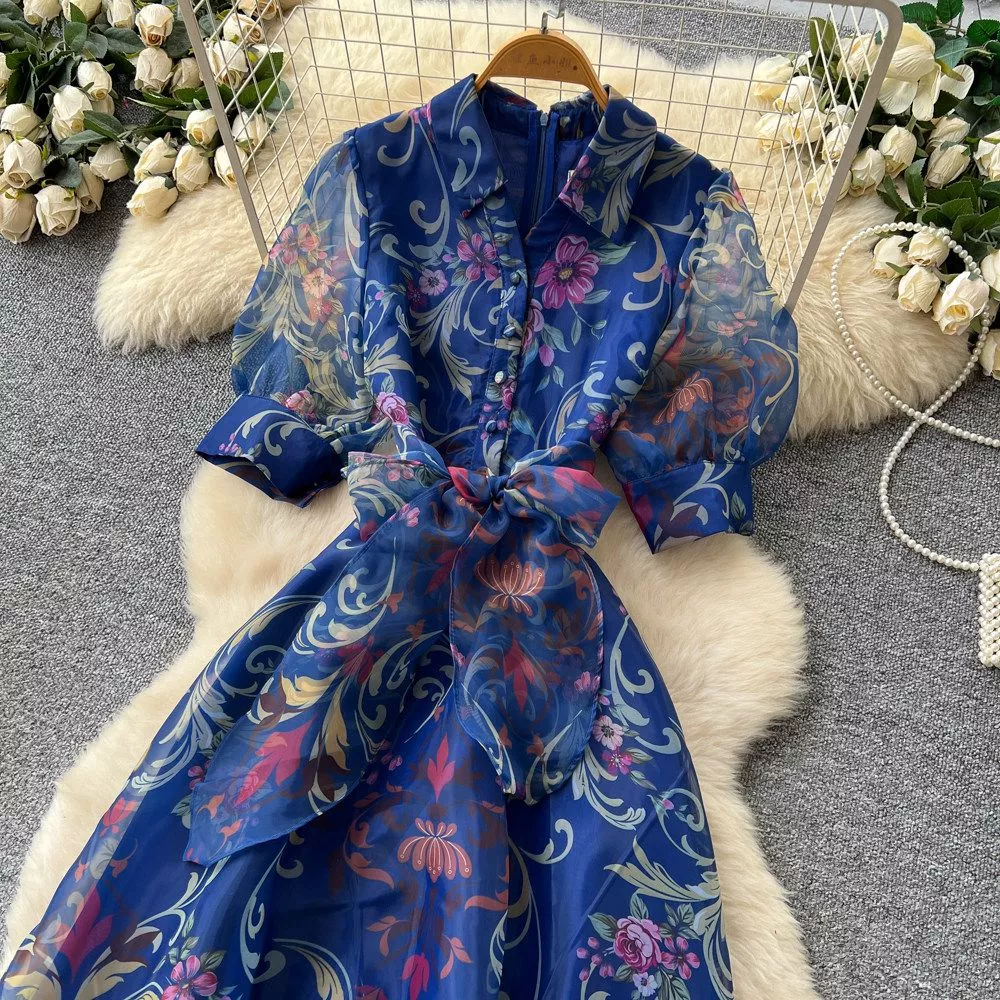 Abito lungo elegante dallo stile romantico e raffinato, caratterizzato da una stampa floreale con eleganti motivi arabeschi che donano movimento e profondità al tessuto leggero. La linea ampia della gonna crea un effetto scenografico e femminile, mentre la cintura in vita valorizza la silhouette definendo il punto vita.