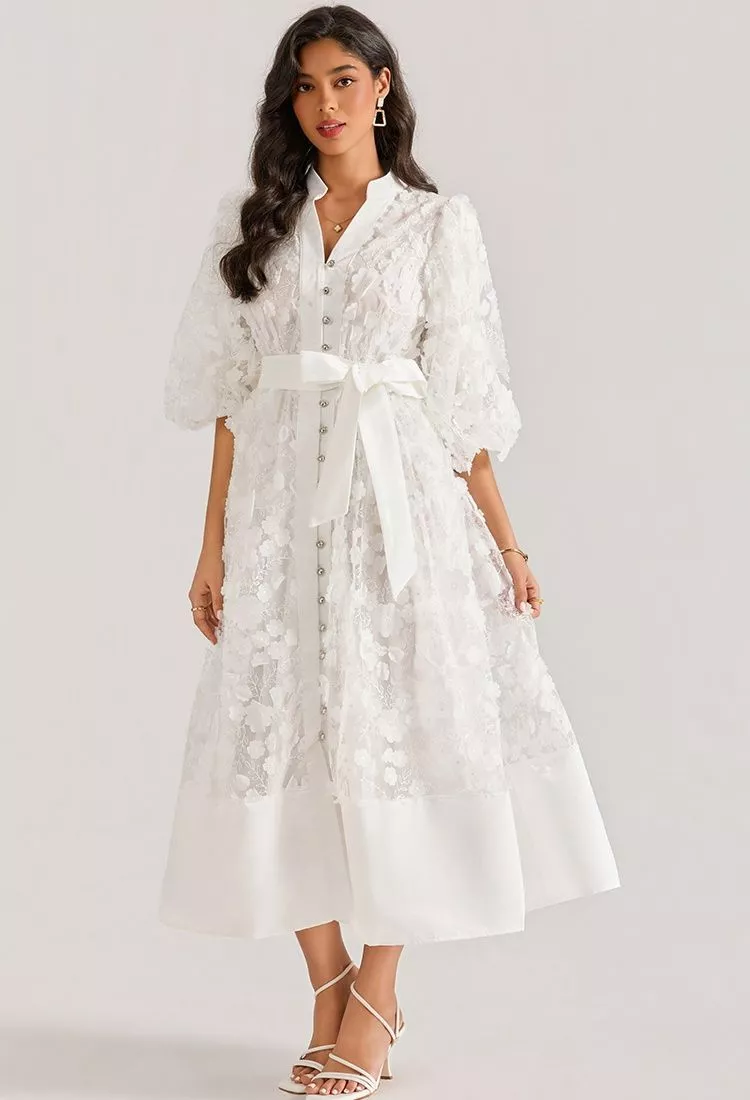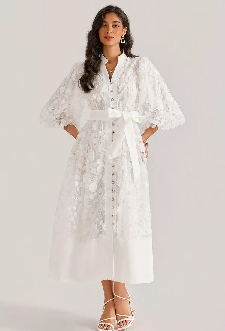Abito Lungo Elegante In Pizzo Con Maniche Ampie Cintura Cerimonia Bianco CF64873