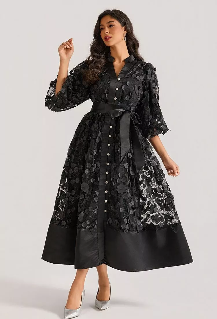 Abito Lungo Elegante In Pizzo Con Maniche Ampie E Cintura Cerimonia Nero CF64873