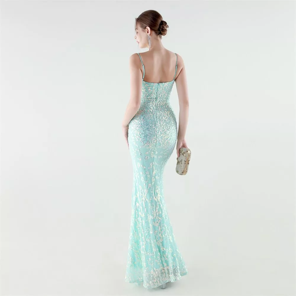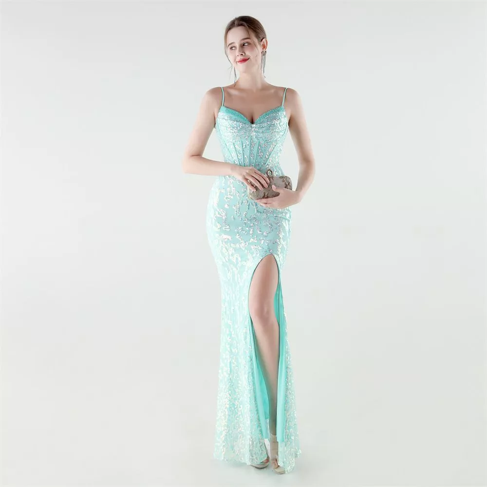 Abito Lungo Elegante Verde Menta Da Sera Con Spalline Sottili E Spacco CF61283