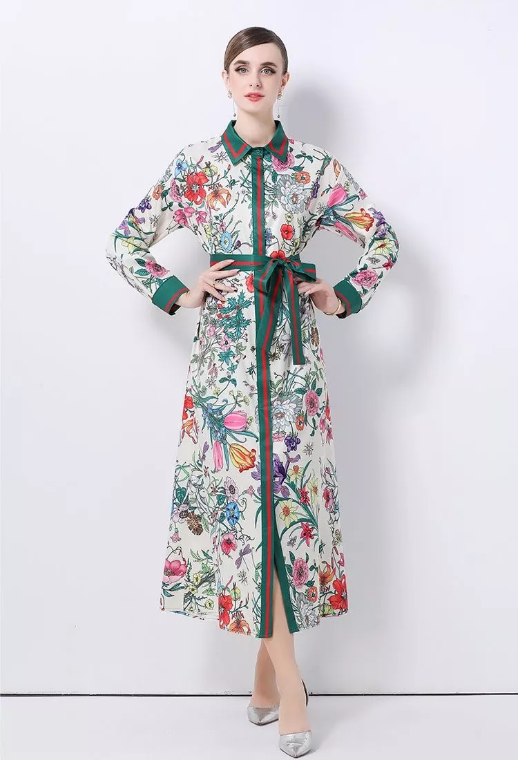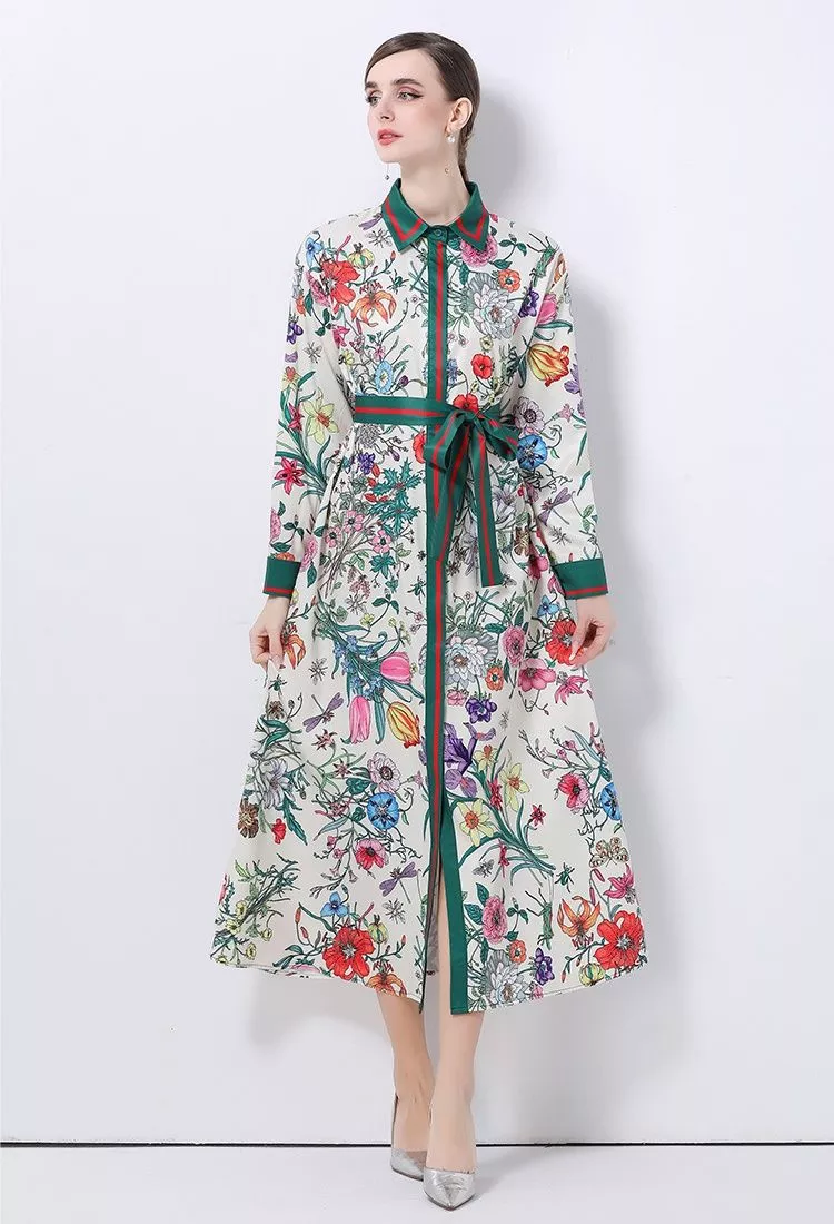 Abito lungo floreale dal design elegante, caratterizzato da linea scivolata e cintura in vita che valorizza la silhouette con stile. Il colletto a camicia e i profili a contrasto donano un tocco ricercato, mentre la stampa floreale all-over illumina ogni look con un'estetica moderna e femminile. Perfetto per cerimonie, eventi speciali e momenti in cui desideri un outfit raffinato che slancia la figura e cattura l'attenzione.