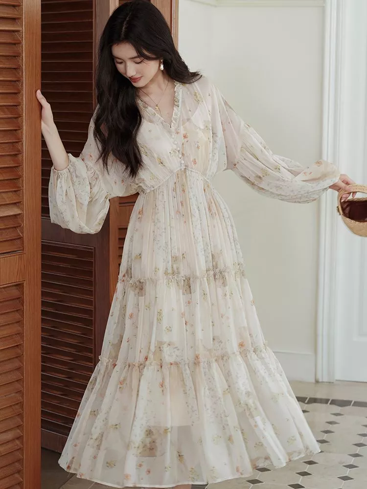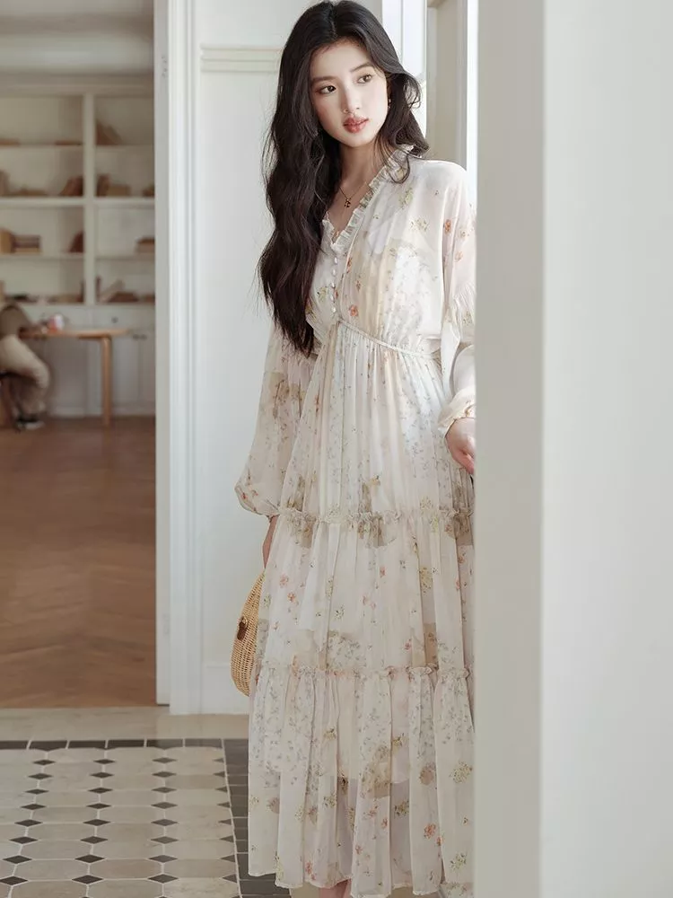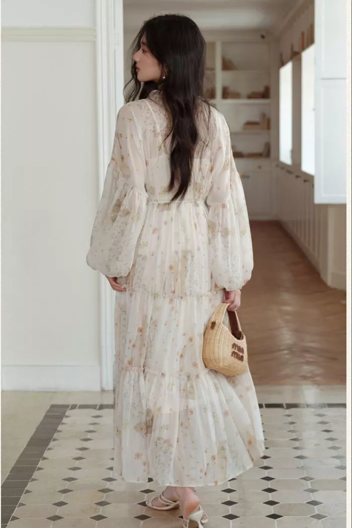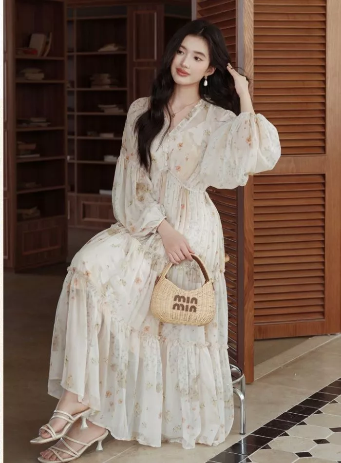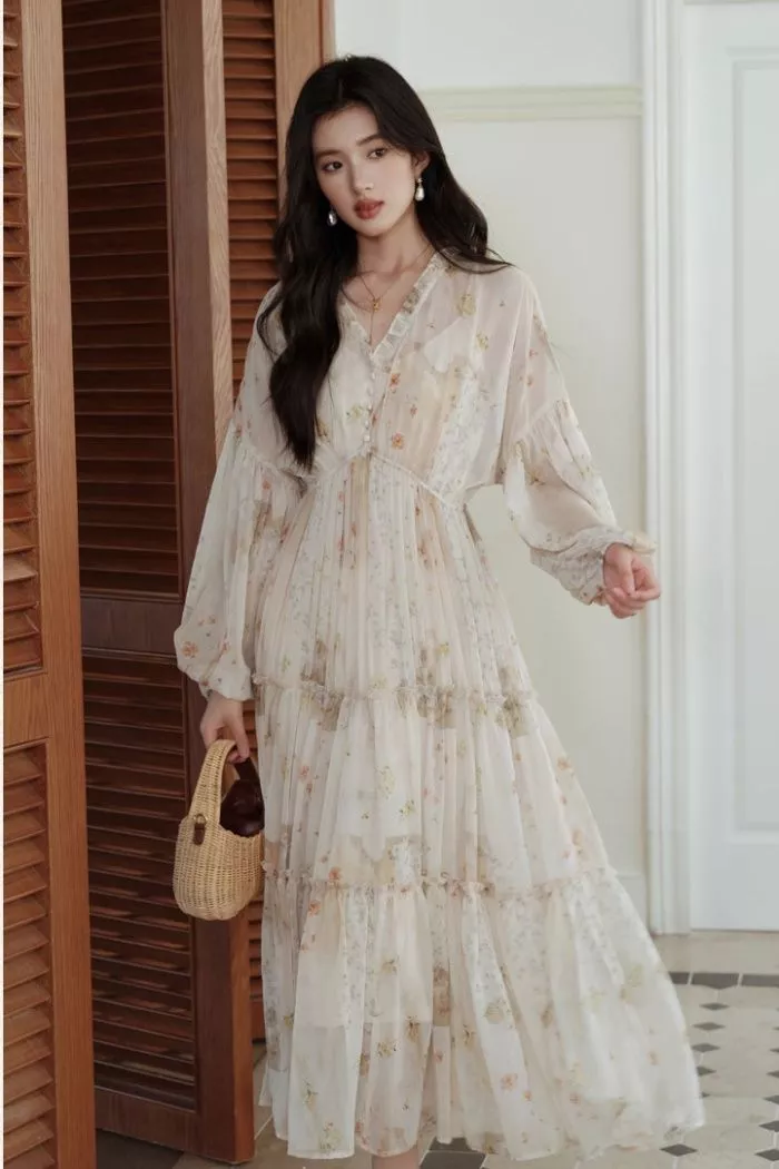 Abito lungo donna dallo stile boho romantico, caratterizzato da una delicata fantasia floreale su base avorio. La linea fluida con balze sovrapposte crea movimento e leggerezza, mentre la vita alta elasticizzata valorizza la silhouette definendo il punto vita con naturalezza.