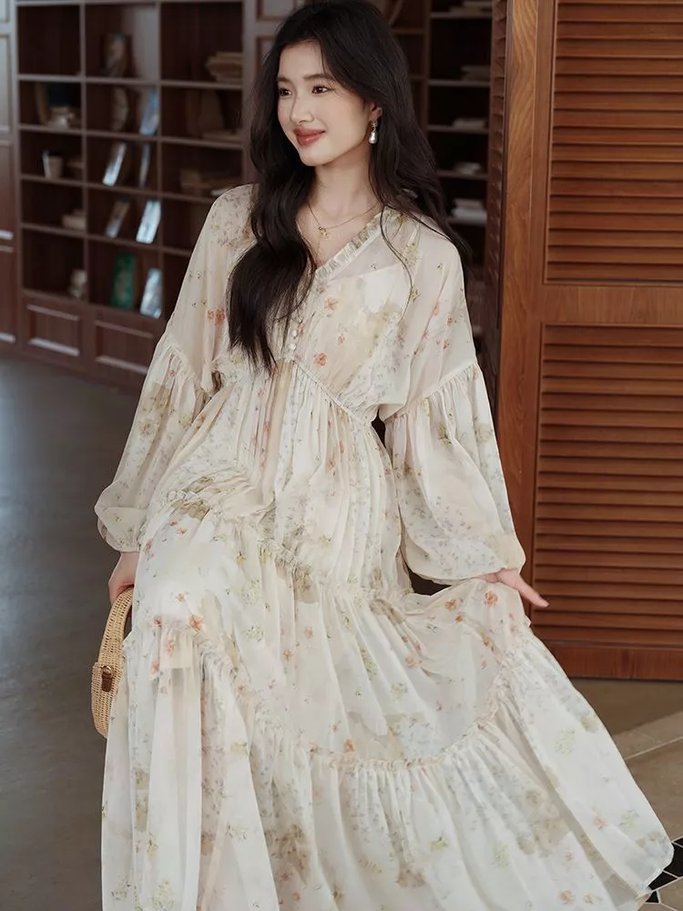 Abito Lungo Floreale Boho Elegante Con Balze E Vita Alta Avorio CF67779