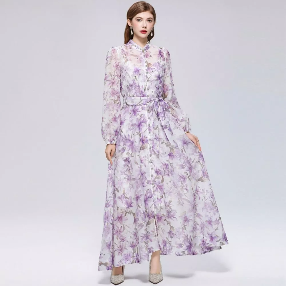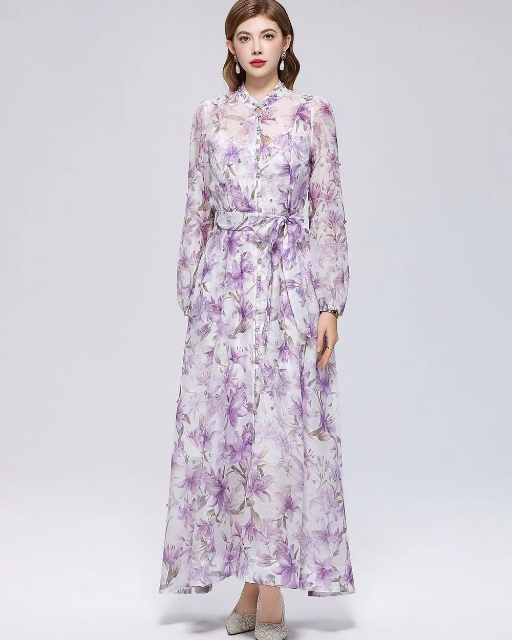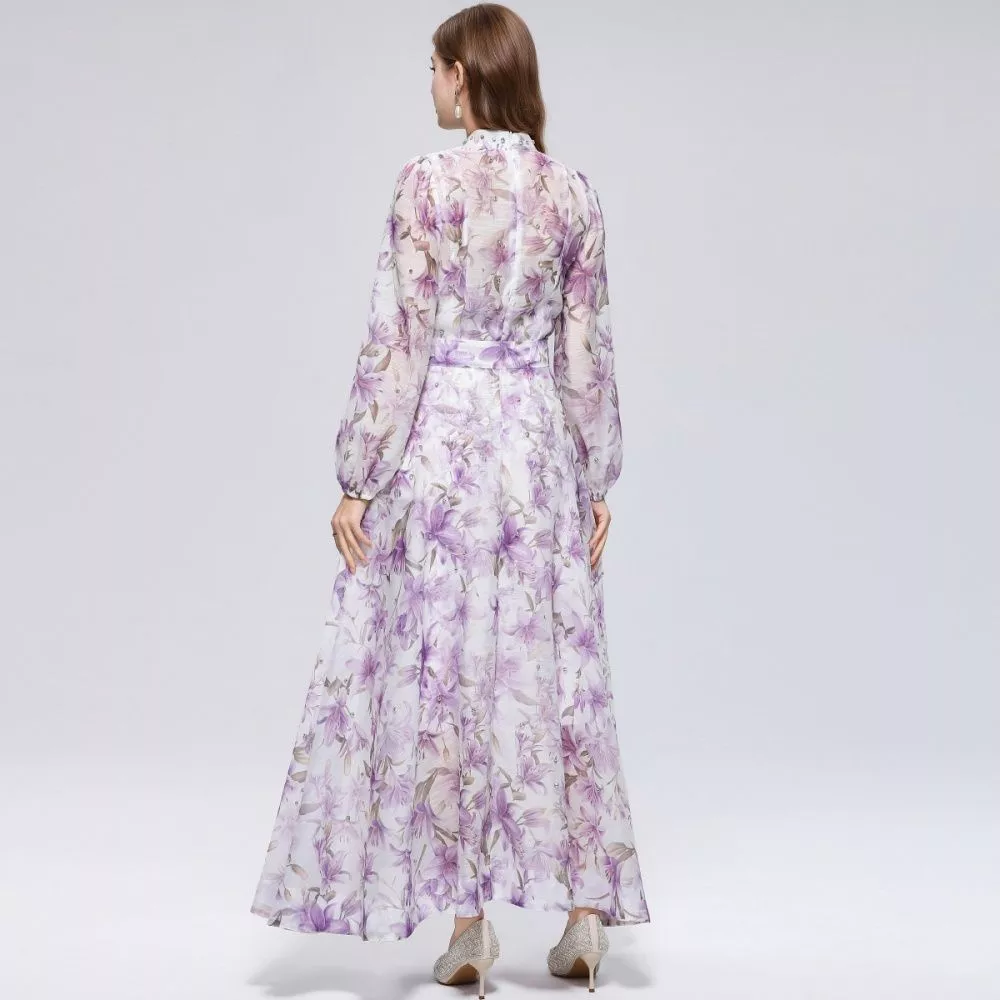 Abito Lungo Floreale Lilla Elegante Con Cintura Stile Romantico Lavanda CF69992