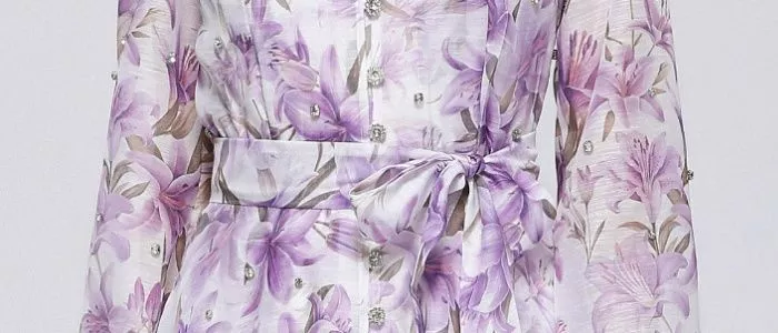 Vestito lungo floreale dal carattere elegante e delicato, caratterizzato da una base chiara impreziosita da una stampa nei toni del lilla e della lavanda. Le sfumature morbide creano un effetto visivo armonioso, ideale per chi cerca uno stile femminile e raffinato.