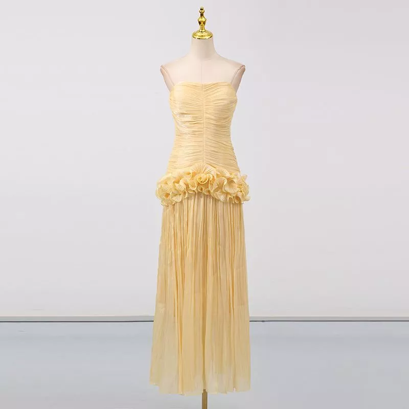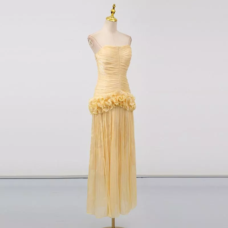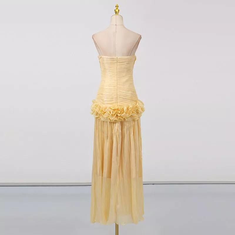 Abito Lungo Giallo Elegante Senza Spalline Balze Fascia Evento Sera CF58933