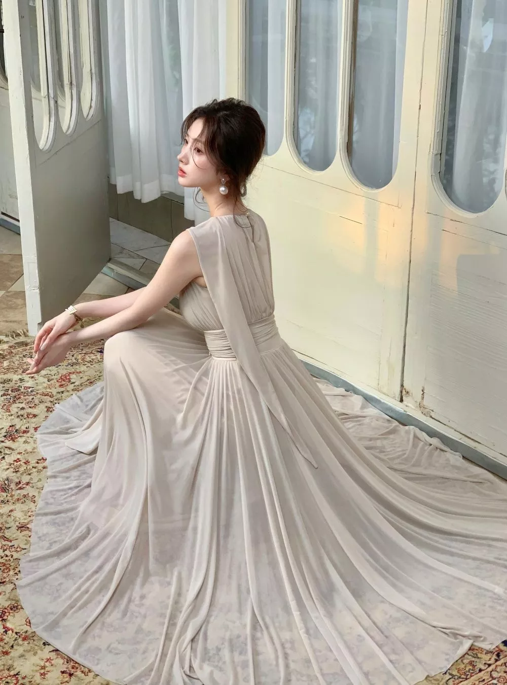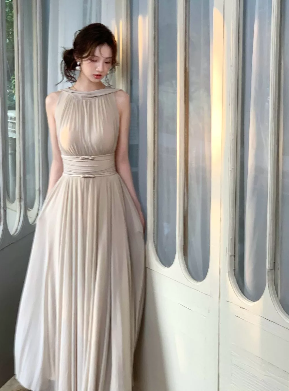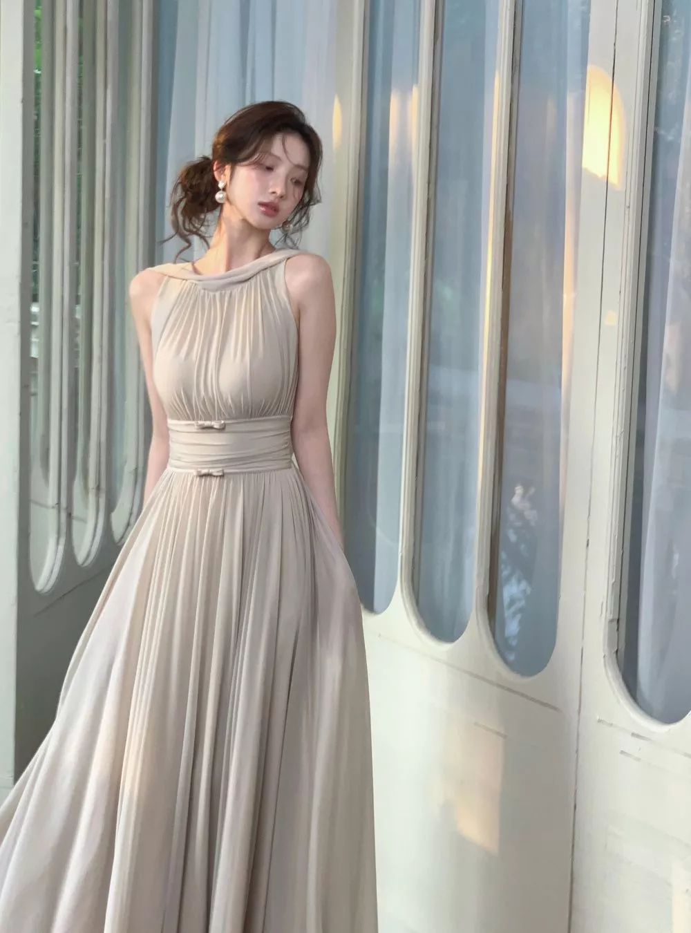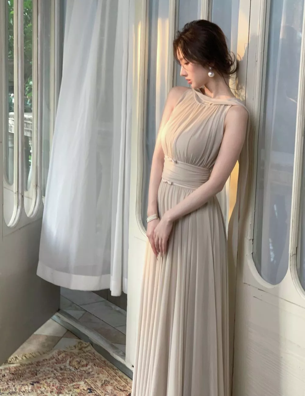 Un abito lungo elegante e raffinato, pensato per valorizzare la silhouette con classe e delicatezza. Il design senza maniche è impreziosito da un raffinato scollo drappeggiato e una vita segnata che esalta il punto vita. La gonna ampia e fluida scende leggera, creando un movimento armonioso ad ogni passo. Ideale per eventi formali, ricevimenti, cerimonie o serate importanti, questo abito si distingue per la sua linea sofisticata e il fascino senza tempo. Disponibile in due tonalità chic: un delicato beige e un luminoso grigio chiaro, perfetti per risplendere con eleganza.