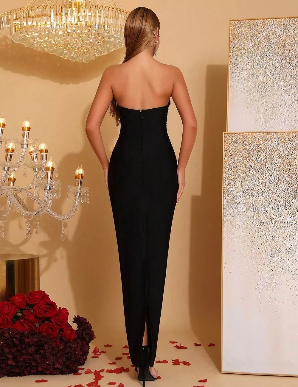 La linea lunga e pulita del fondo contribuisce a slanciare la figura, mantenendo un equilibrio perfetto tra sensualità ed eleganza. Ideale per chi desidera un outfit scenografico ma raffinato, capace di distinguersi senza risultare eccessivo.