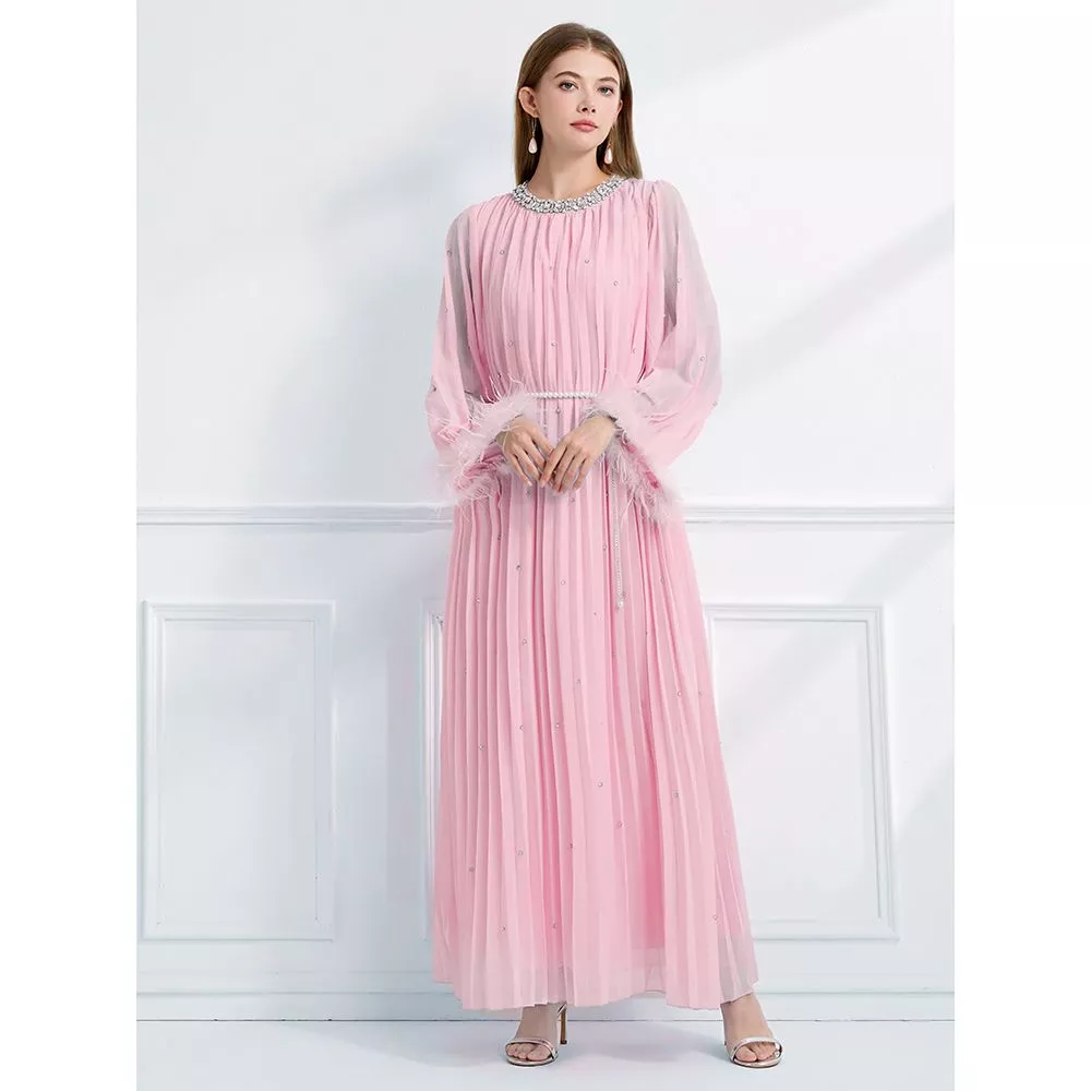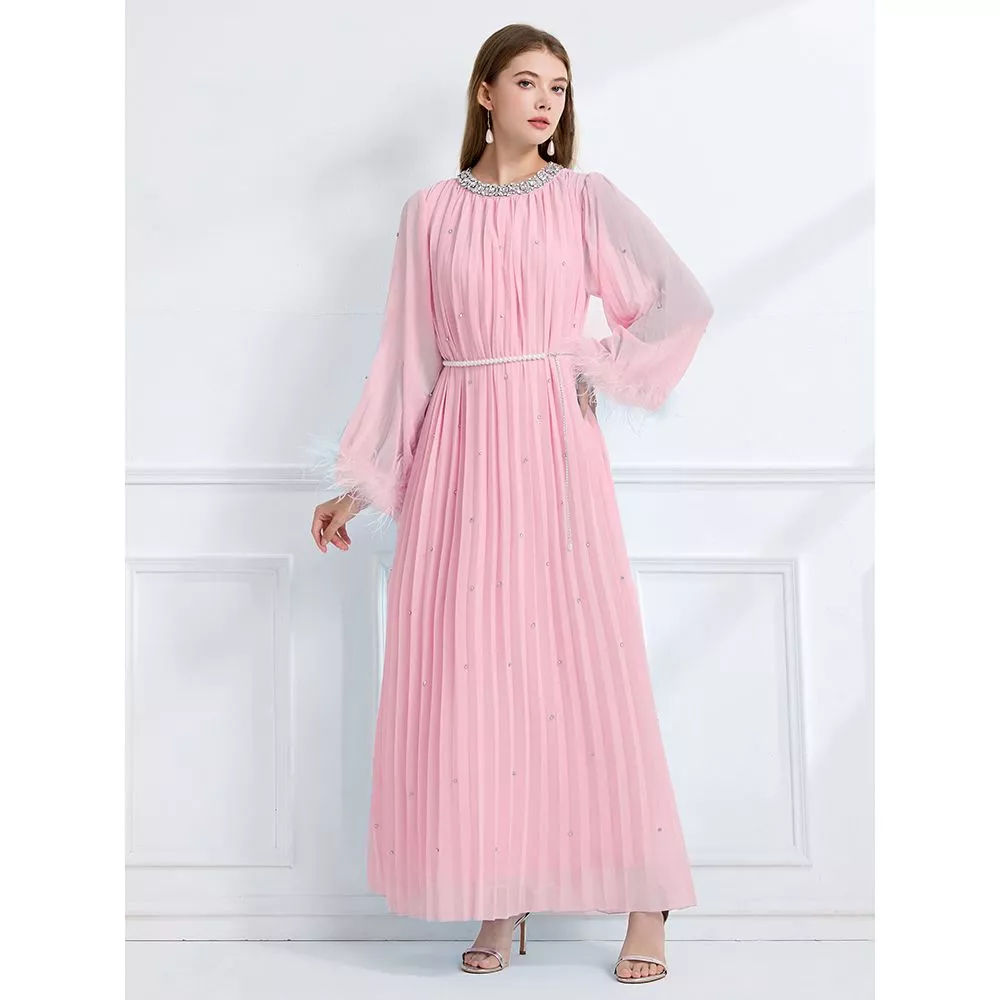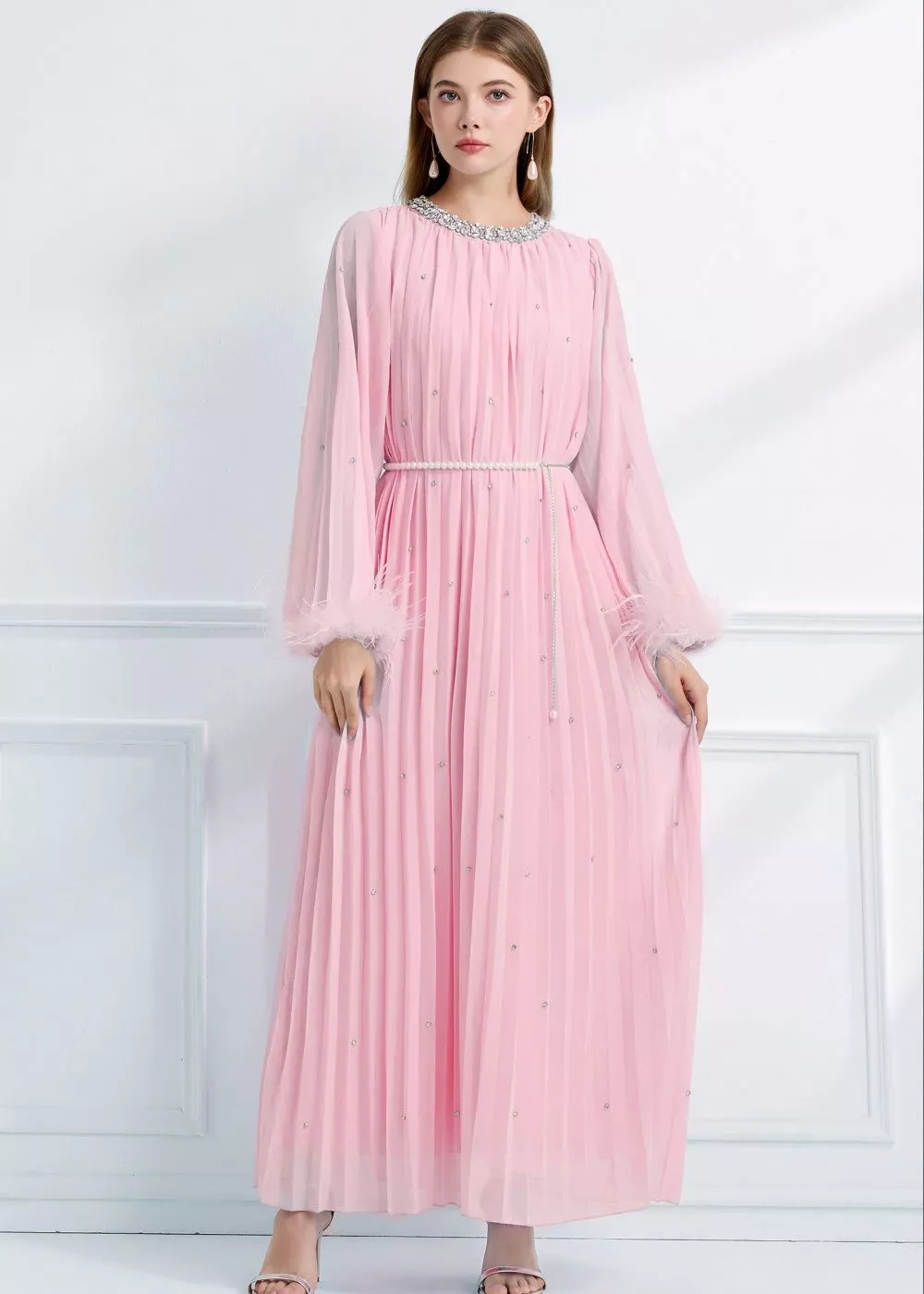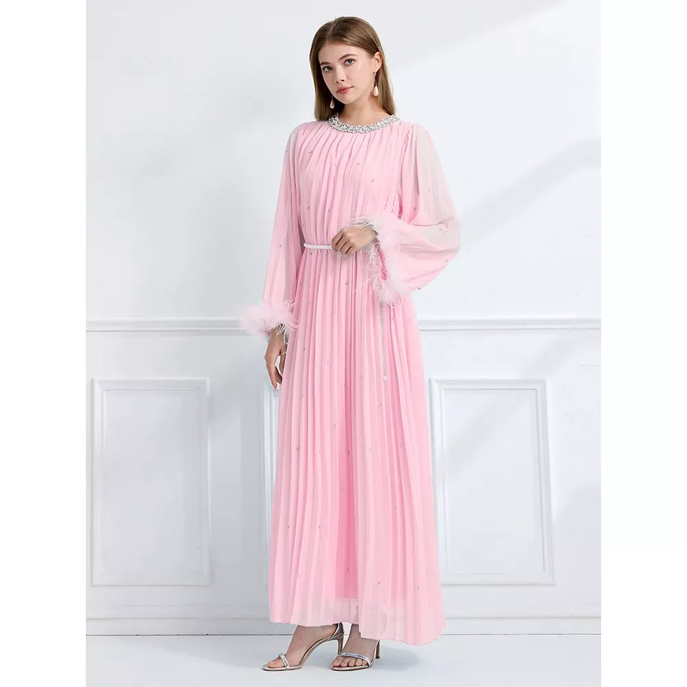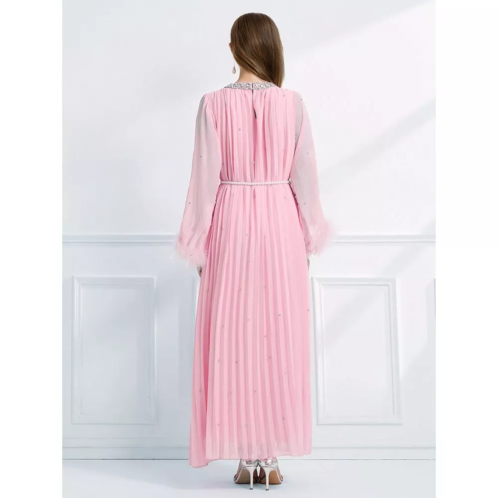 Abito Lungo Rosa Cipria Elegante Con Piume Ai Polsi E Strass Luminosi CF57902