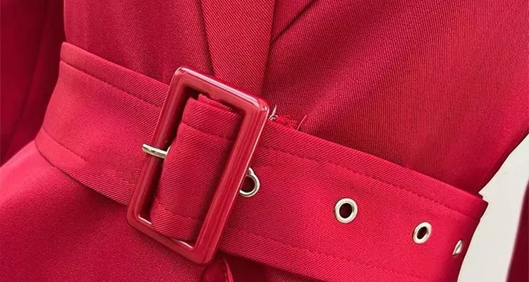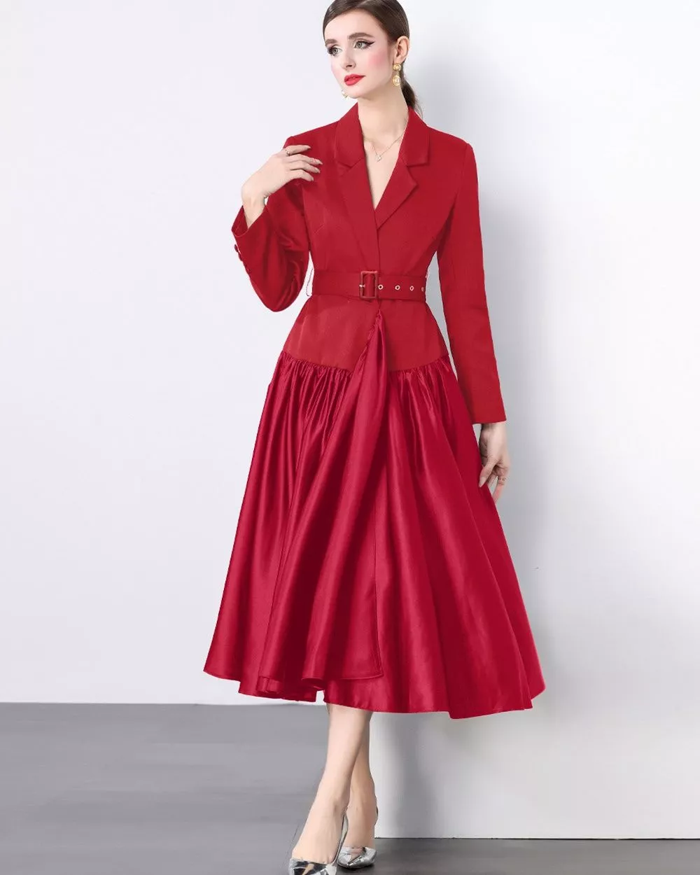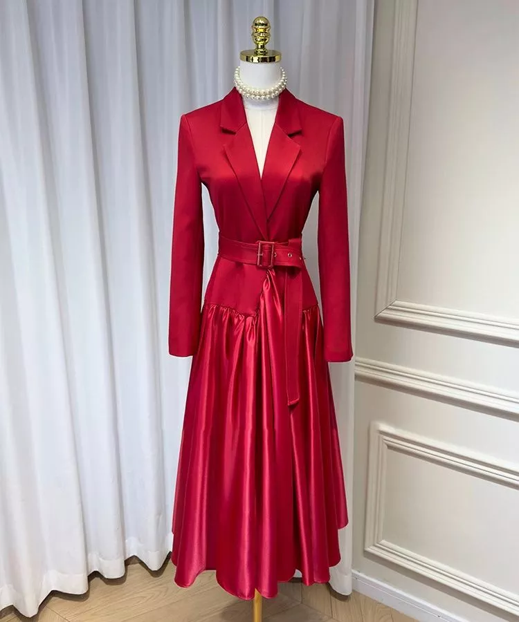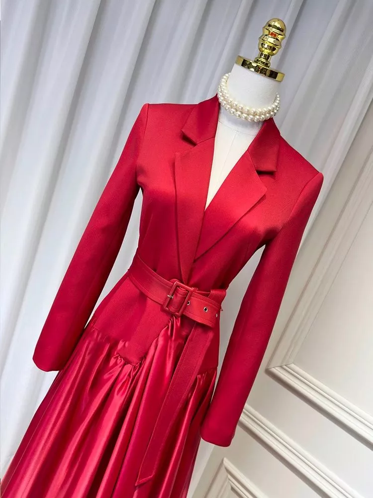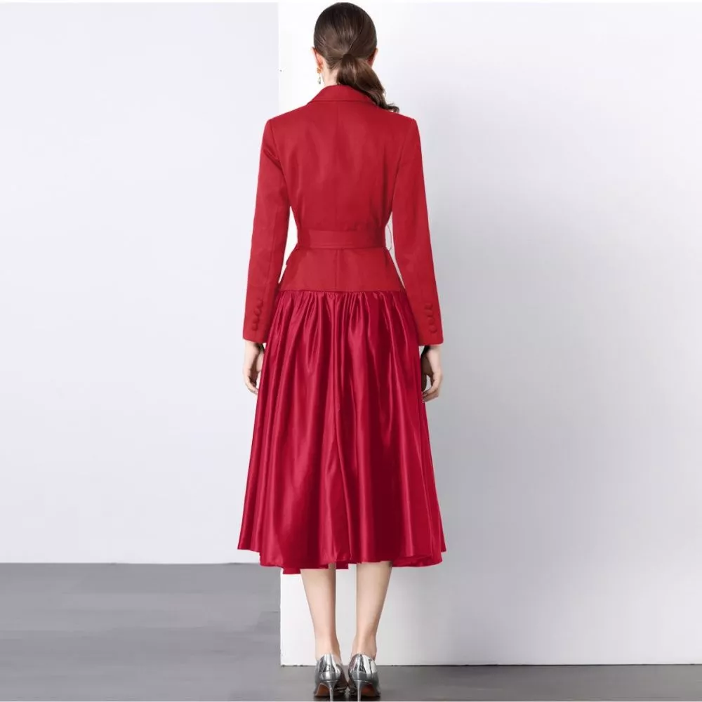 Abito lungo rosso dal taglio elegante e femminile, con giacca strutturata, cintura regolabile e gonna ampia effetto satin che valorizza la silhouette con classe.