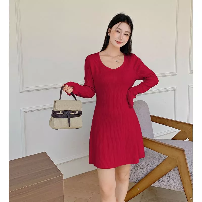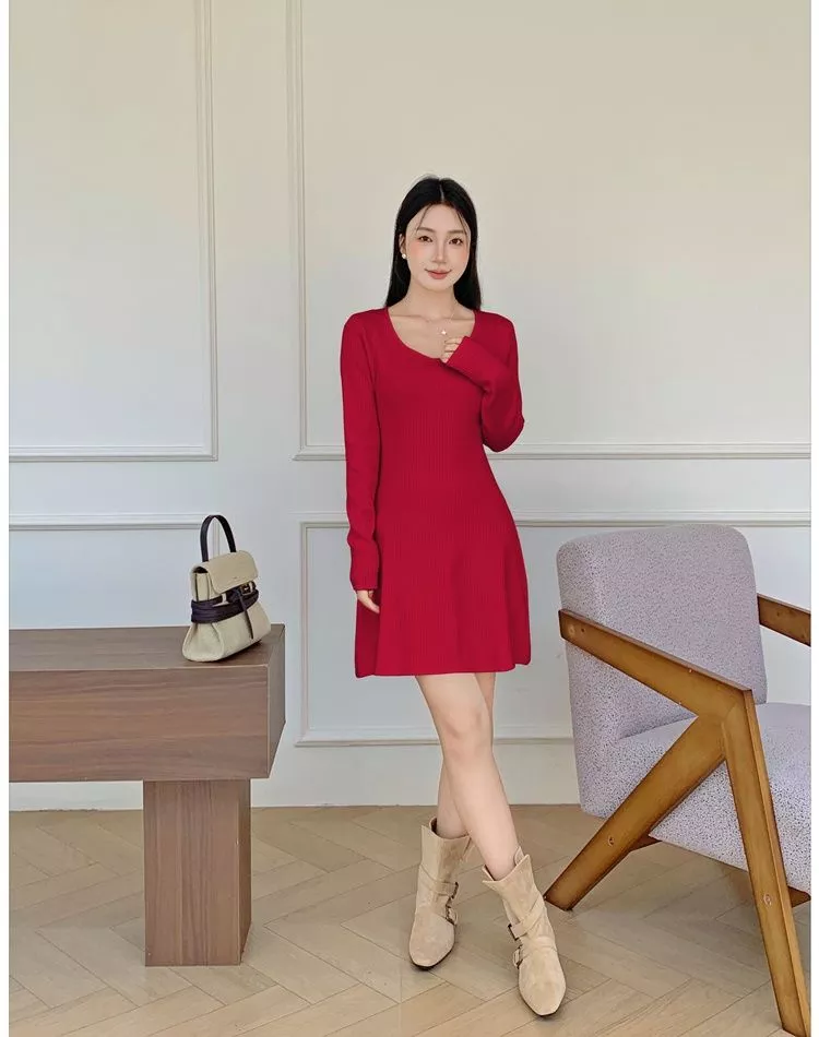 Abito Maglia Rosso Svasato Scollo Cuore Elegante Morbido CF55439