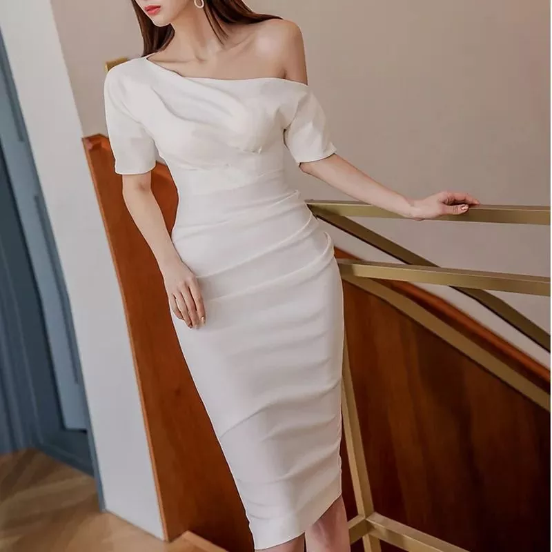 Abito Midi Aderente Elegante Donna Scollo Asimmetrico Bianco X4K9P2