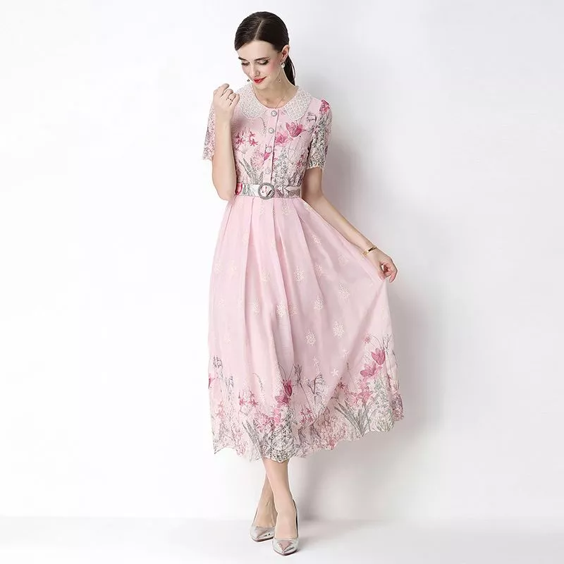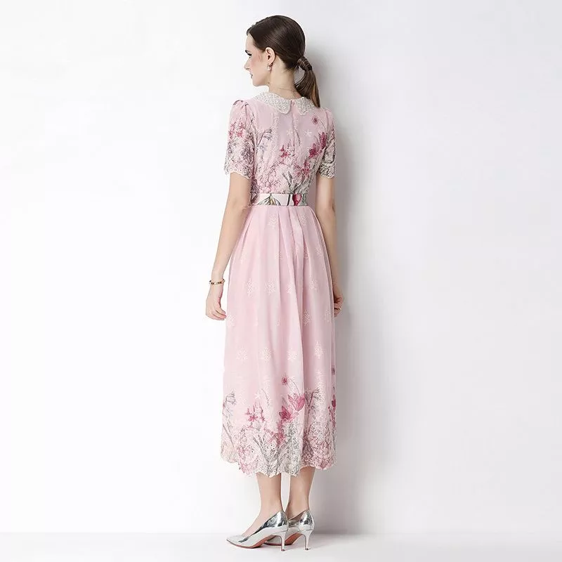 Vestito midi elegante caratterizzato da una stampa floreale delicata abbinata a dettagli ricamati che donano profondità e raffinatezza. Il design valorizza la silhouette grazie al punto vita definito e alla gonna ampia che scende morbida creando movimento.