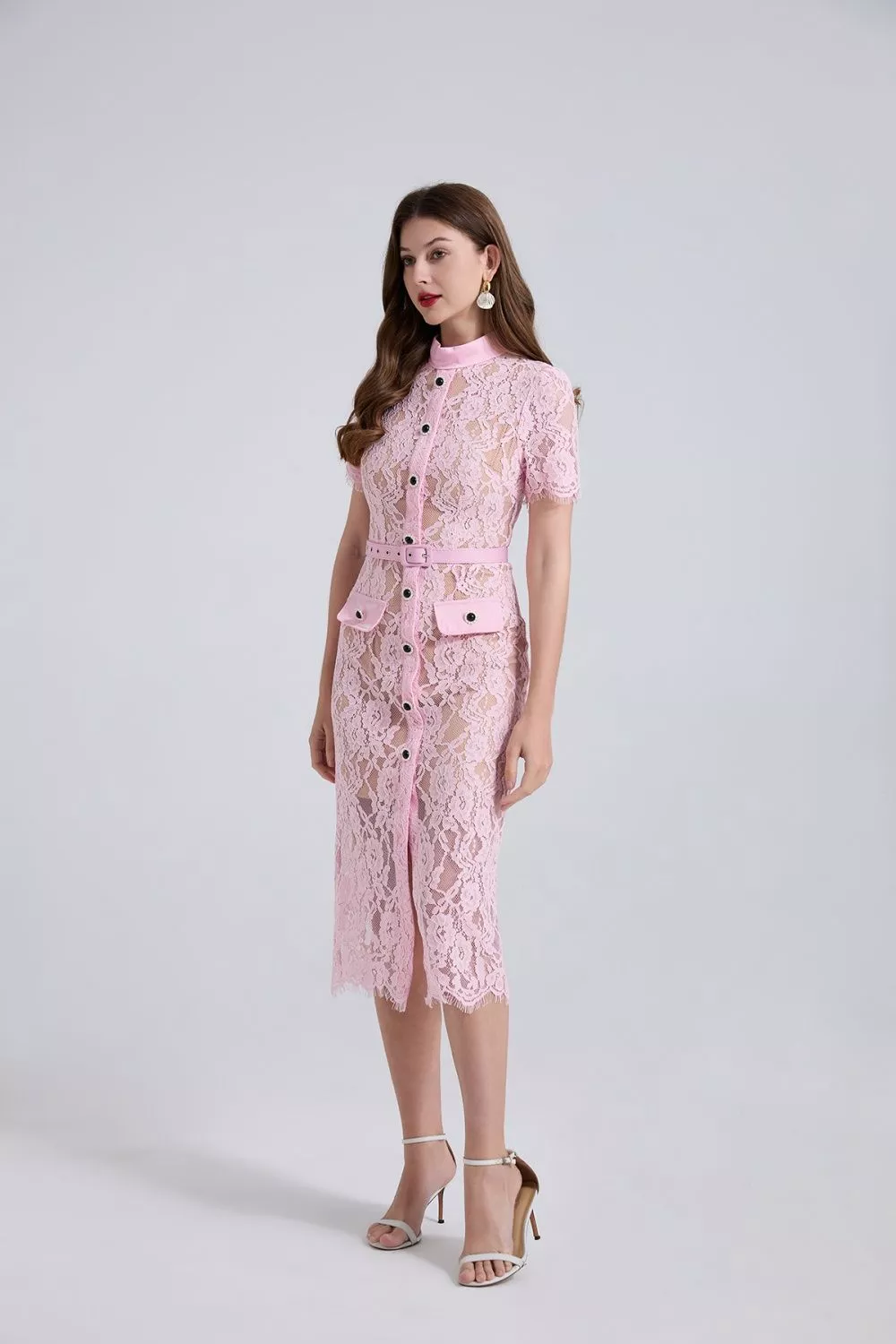 Vestito longuette in pizzo dal fascino elegante e femminile, perfetto per cerimonie, eventi e occasioni speciali. Il design con bottoni frontali, cintura coordinata e silhouette midi valorizza la figura creando un look raffinato e senza tempo. Un capo ideale per outfit da invitata, sera o occasioni importanti.