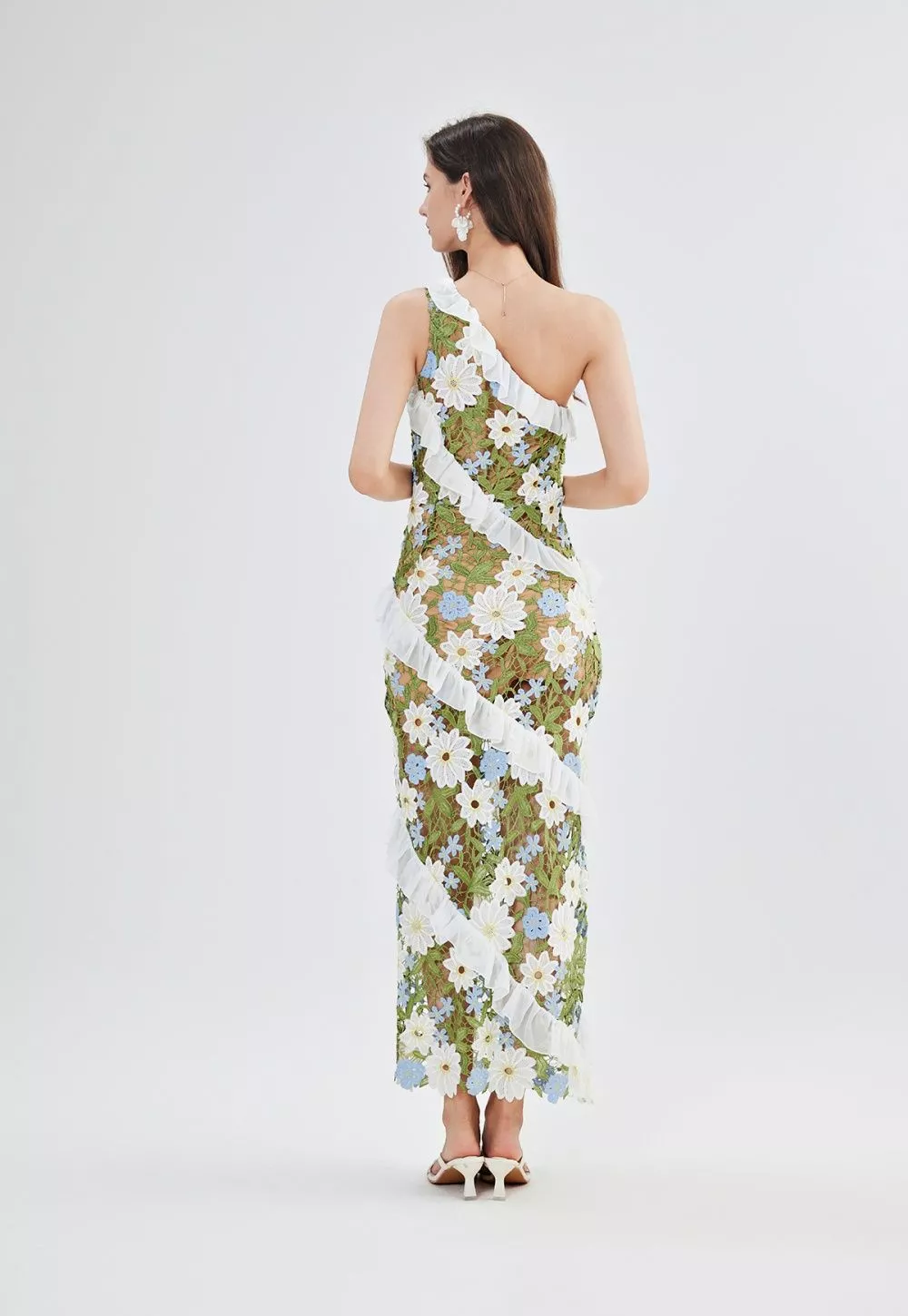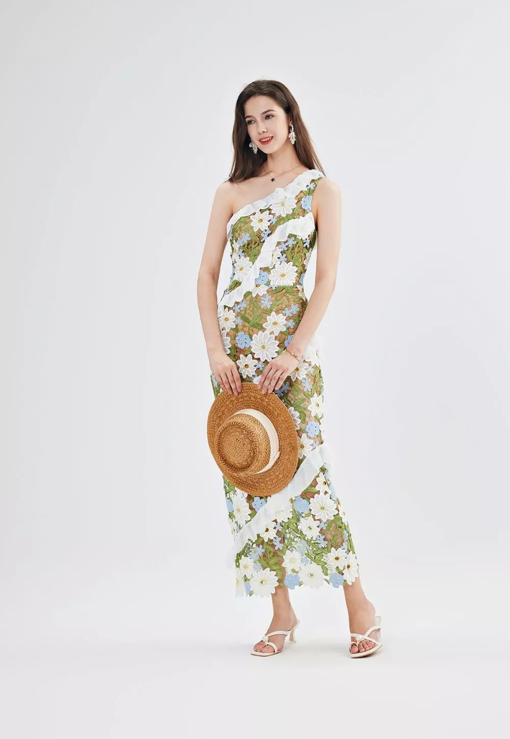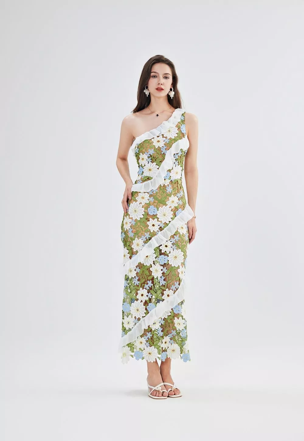 Il pizzo trasparente ricamato con fiori tridimensionali nei toni del bianco, azzurro e verde o lilla regala un tocco etereo, mentre la spallina singola dona modernità e raffinatezza. Perfetto con un sandalo a tacco e accessori luminosi, per un look da vera protagonista.