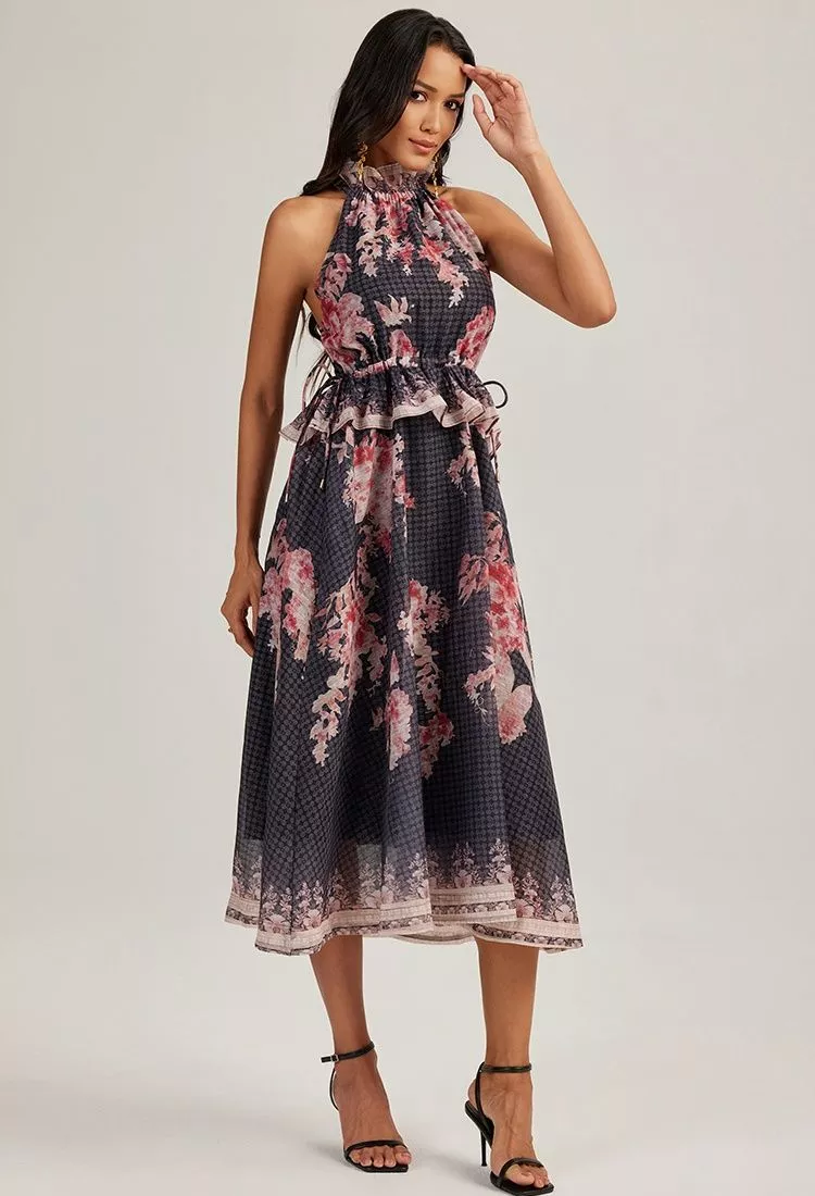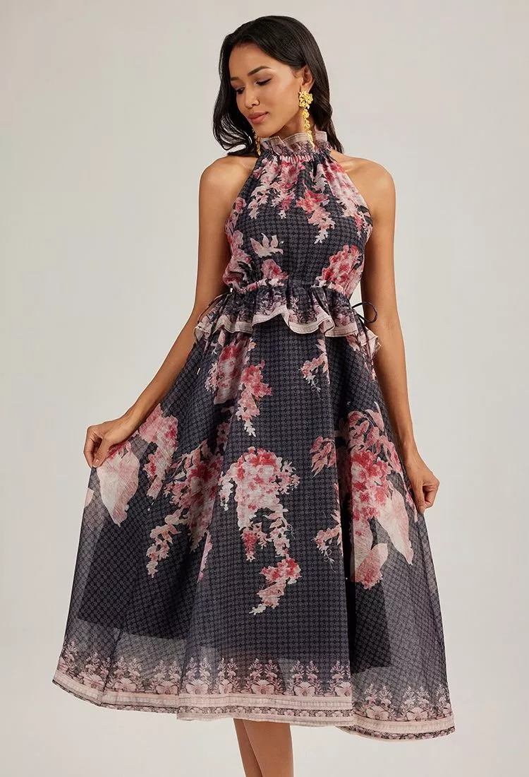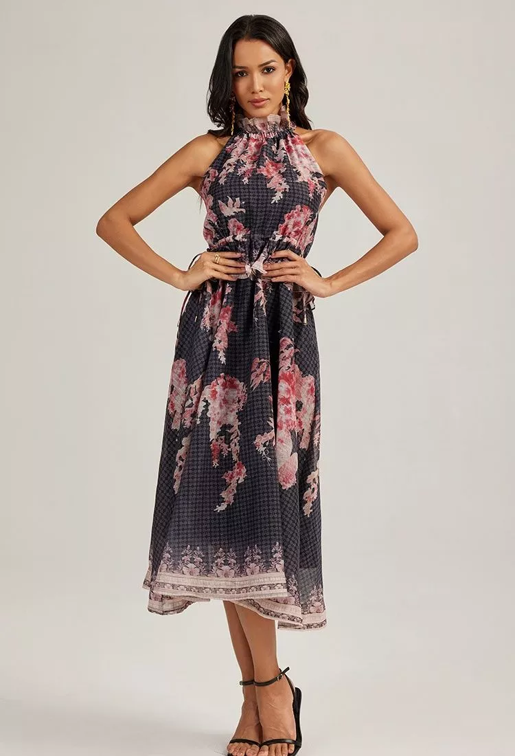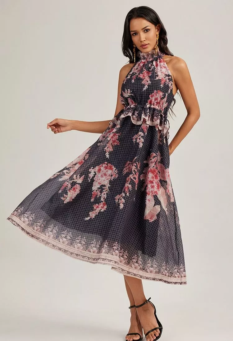 Abito Nero Con Fiori Rosa Stile Halter E Gonna Midi Romantica CF44436