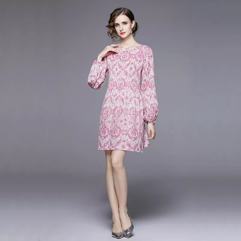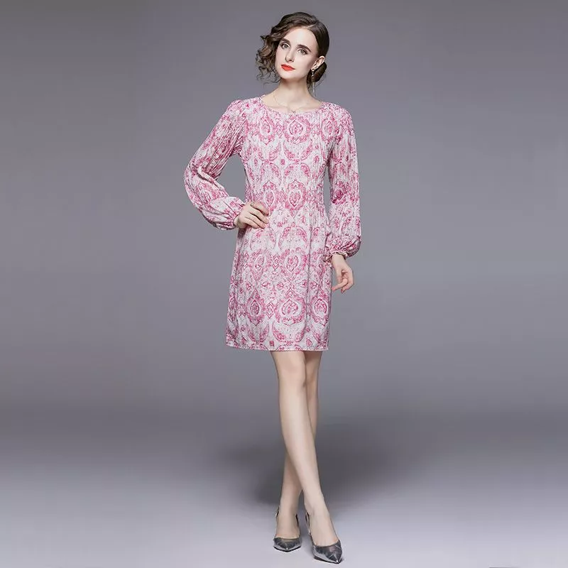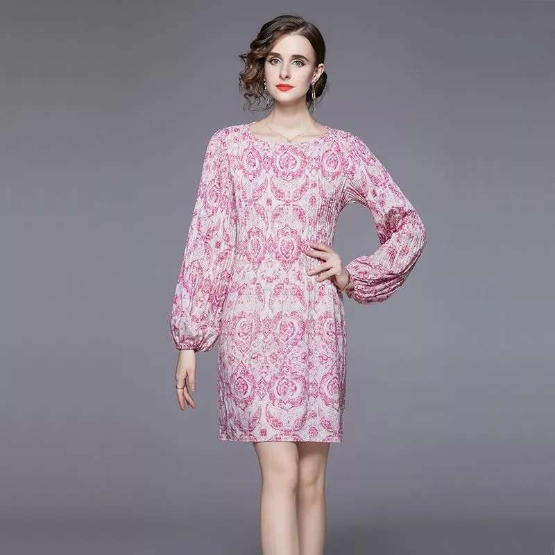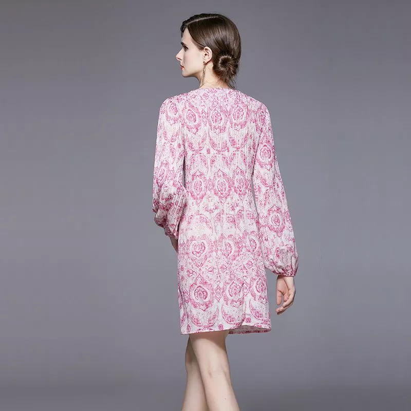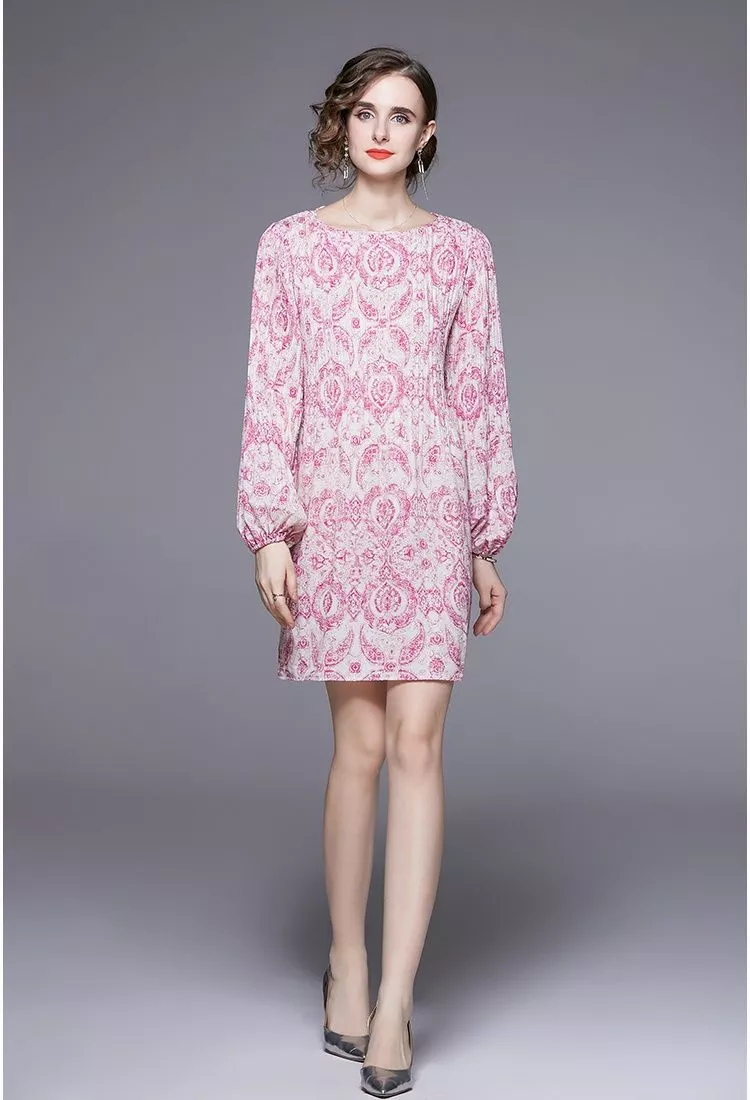 Abito corto rosa con elegante fantasia barocca e maniche lunghe dal taglio morbido.