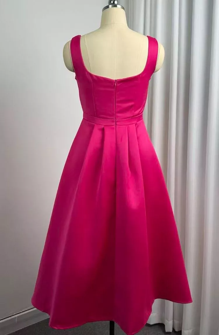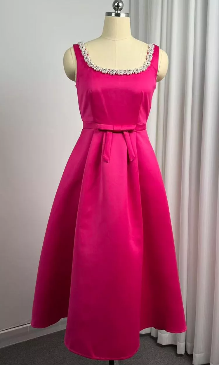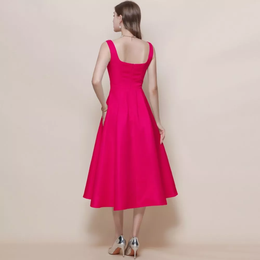 Un modello raffinato e femminile, ideale per cerimonie, eventi o serate eleganti, che combina classe e modernità grazie al suo colore rosa intenso e alla linea midi.