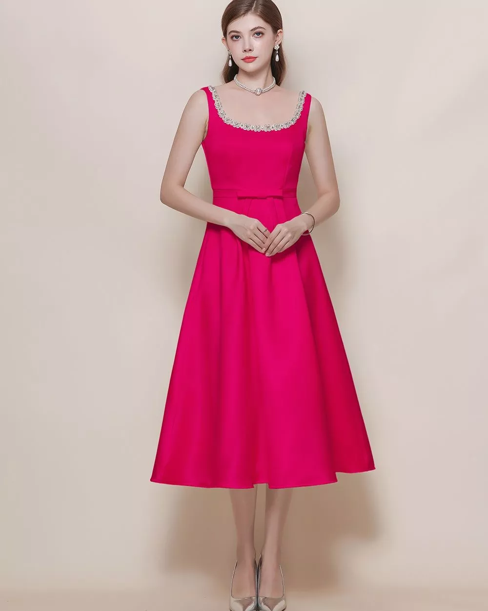 ✨ Dettagli: scollo gioiello, fiocco in vita, linea midi svasata