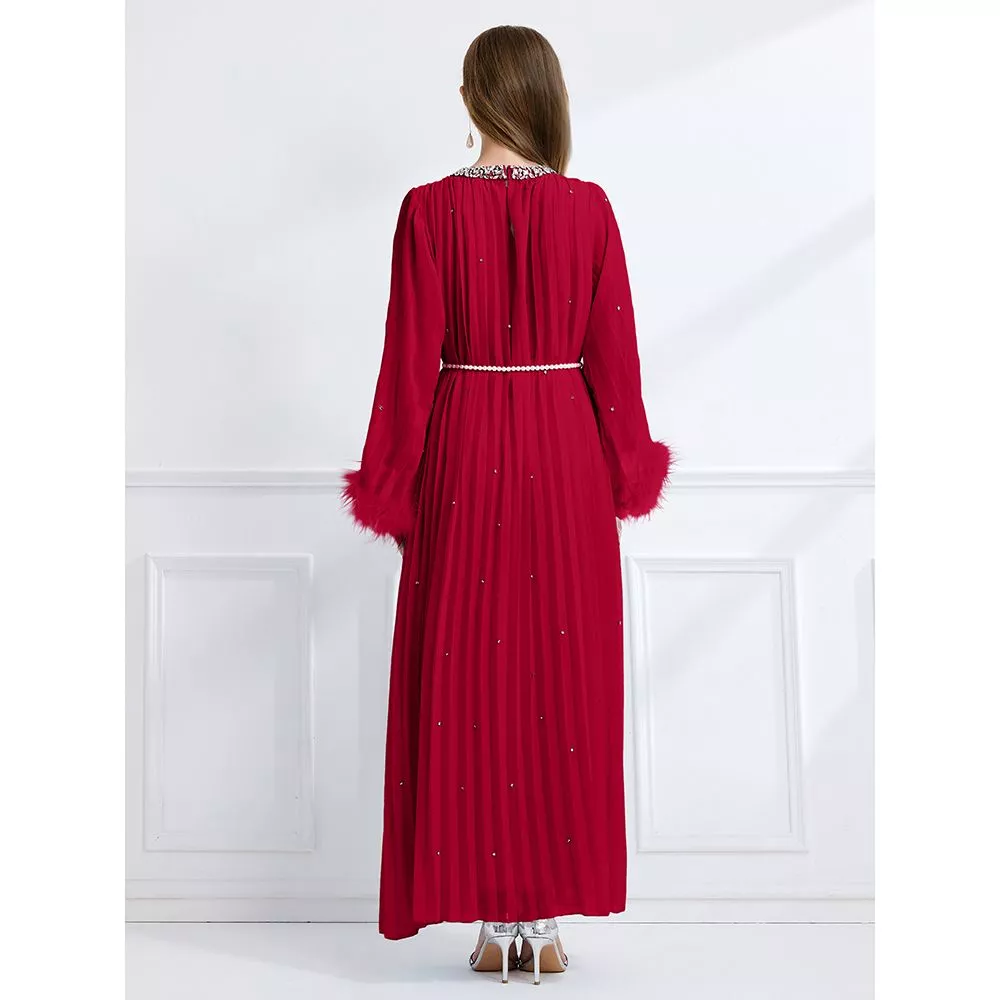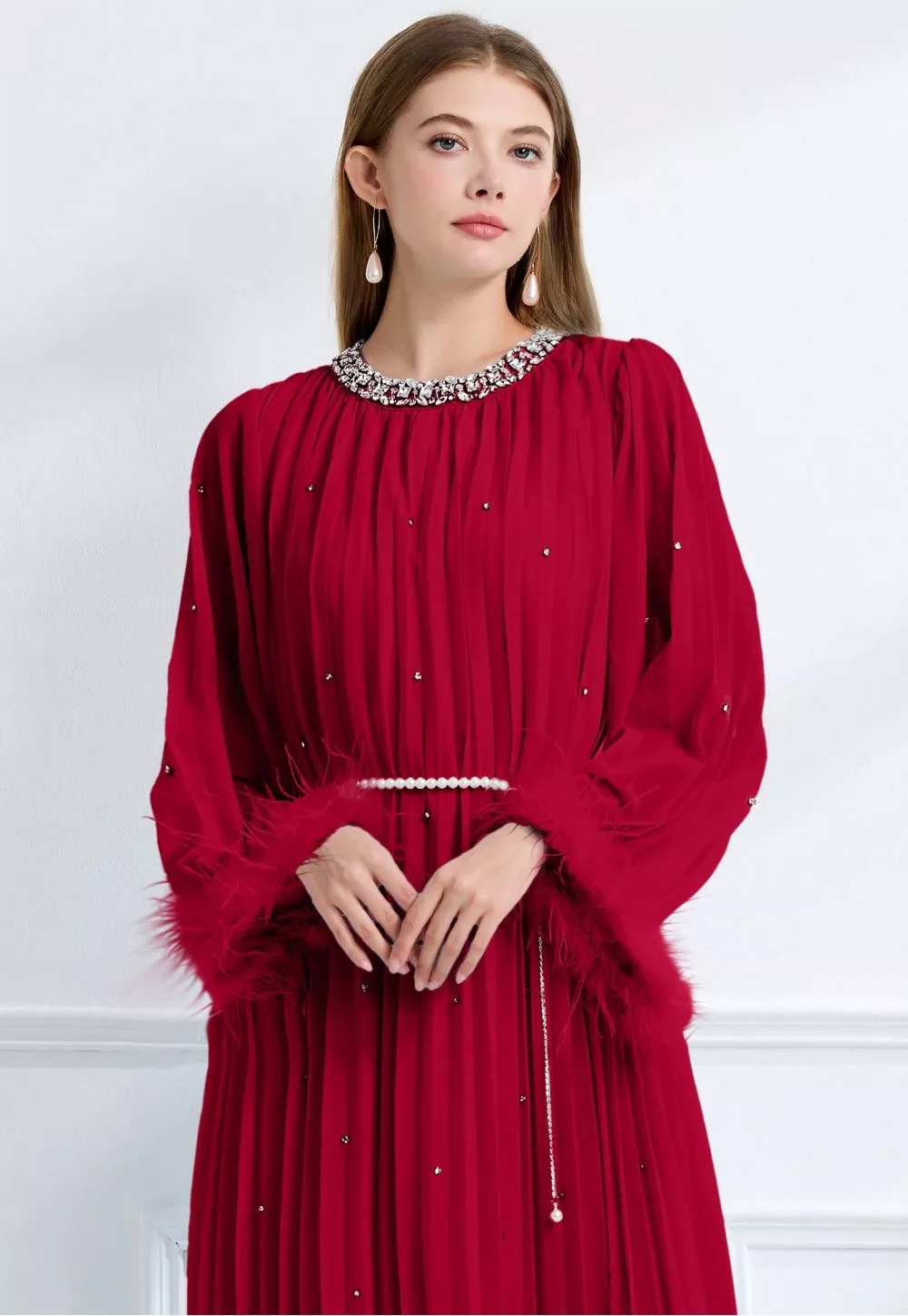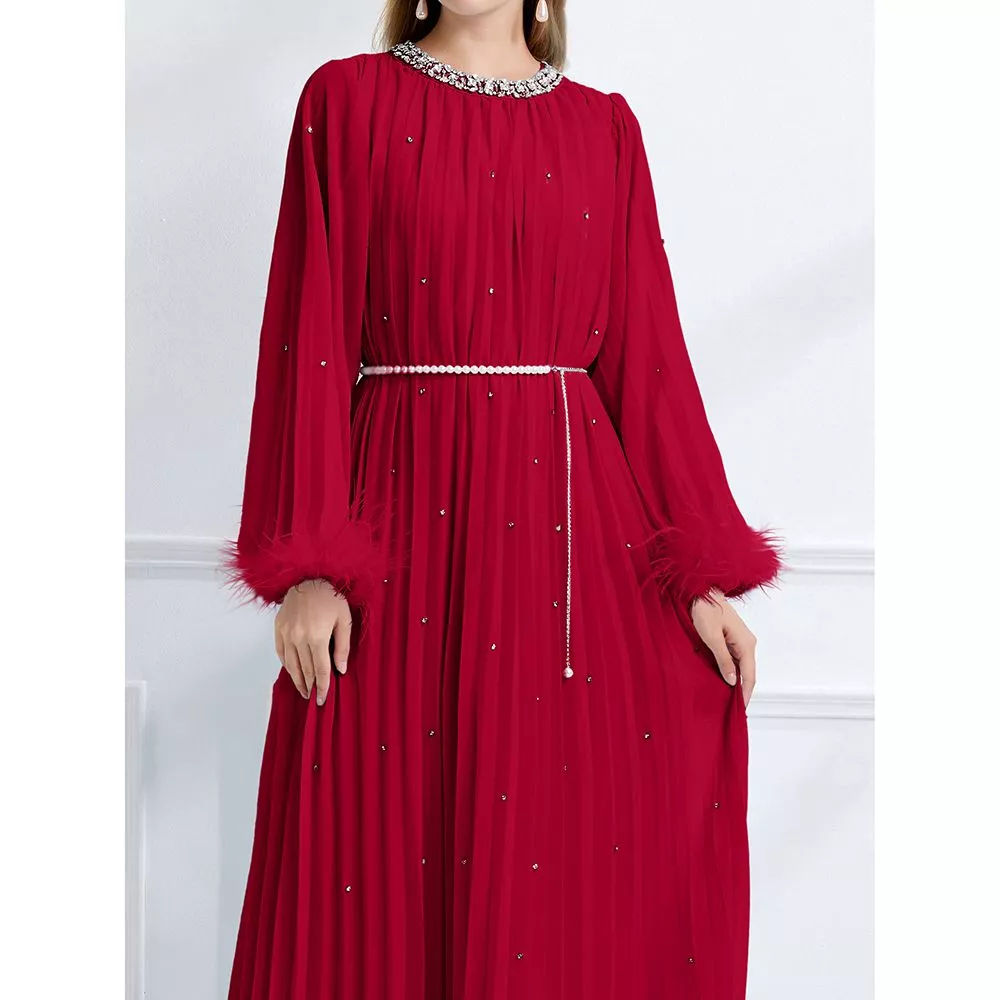 Dettagli: strass luminosi, piume ai polsi, cintura sottile con pendente