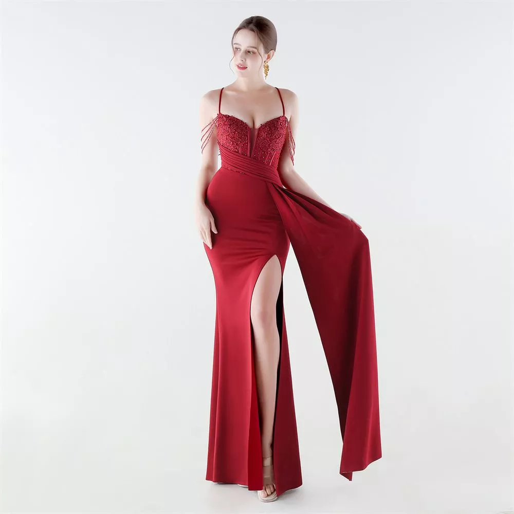 Abito Rosso Vino Elegante Con Spacco Alto E Linea Sirena Da Sera Evento CF67611