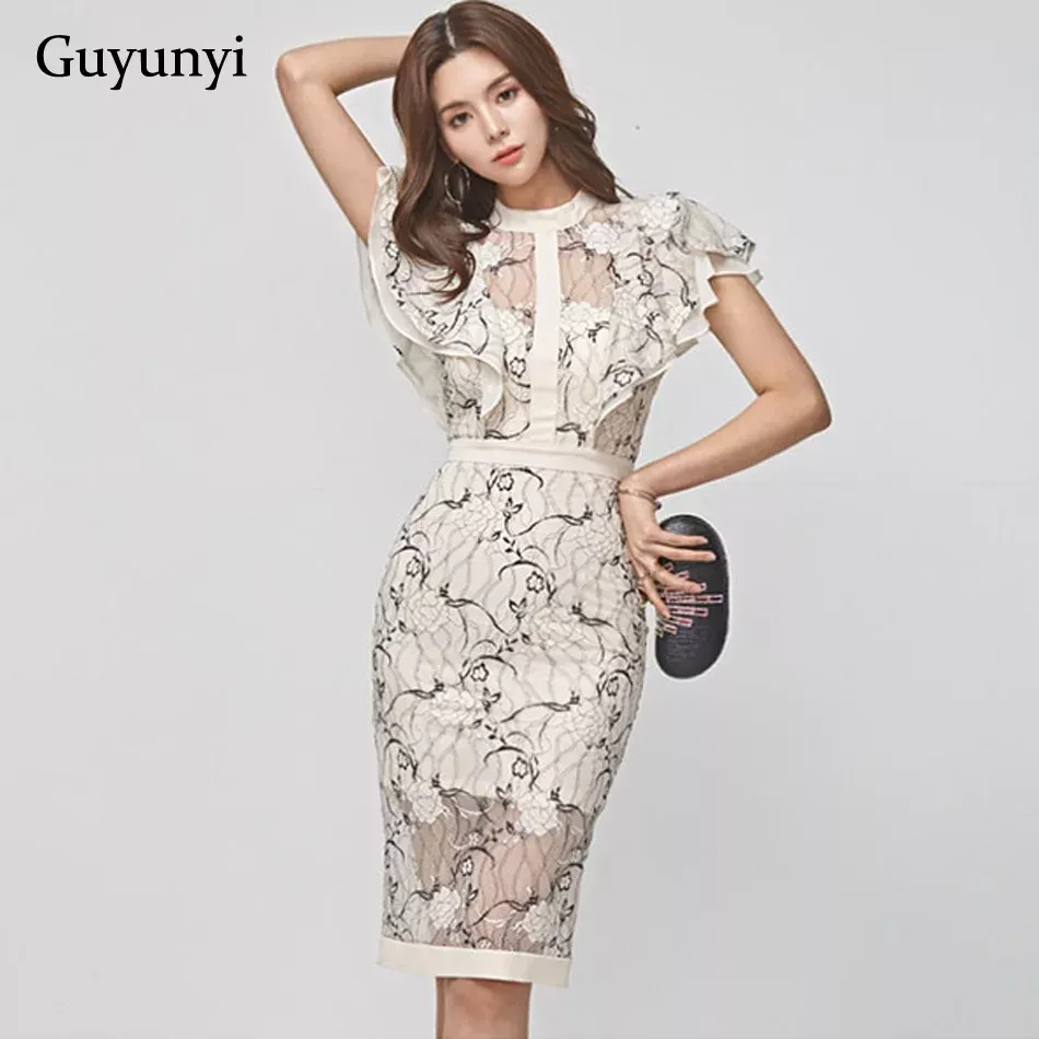 Le maniche corte con volant strutturati introducono un elemento decorativo controllato, bilanciando la ricchezza del pizzo con la linearità della gonna aderente. La lunghezza midi completa il design rendendolo adatto a contesti eleganti, cerimonie e occasioni formali.