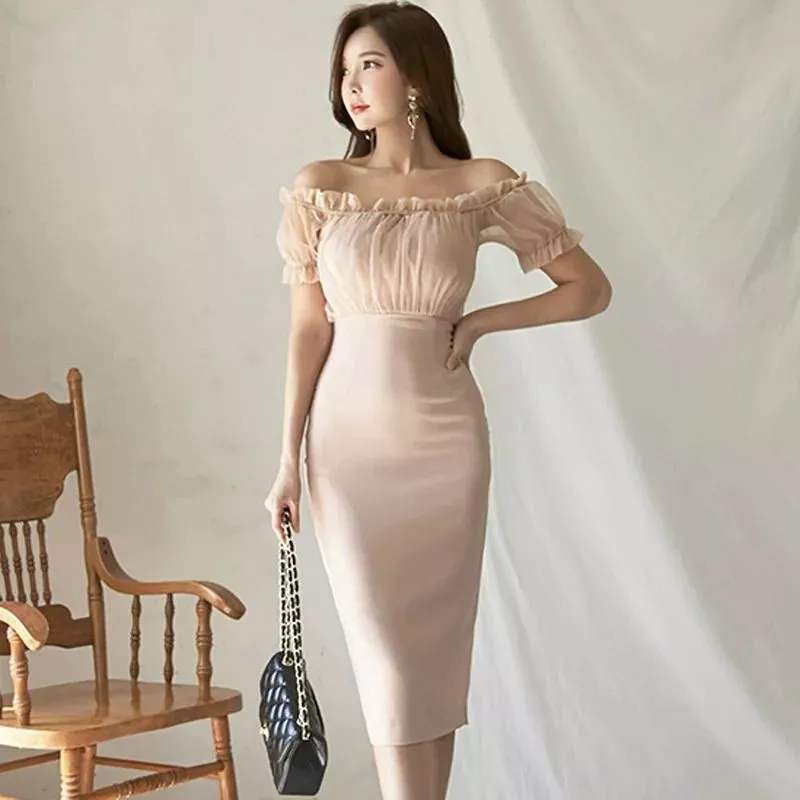Abito Tubino Midi Aderente Elegante Donna Scollo Bardot Beige X4K9P2