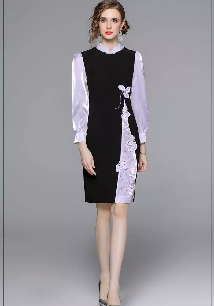 Abito Tubino Nero Con Dettagli Lilla E Fiocchi In Rilievo CF56898