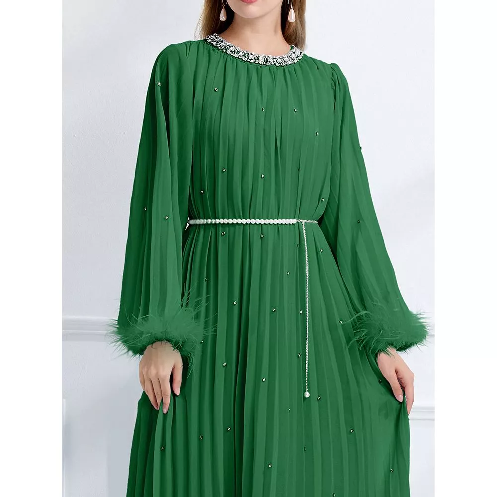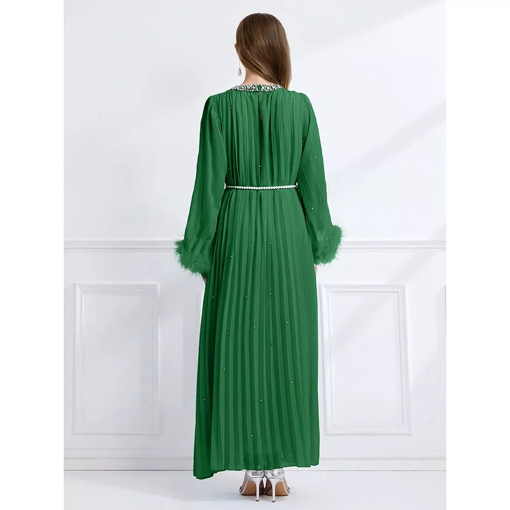 Dettagli: strass luminosi, piume ai polsi, cintura sottile con pendente