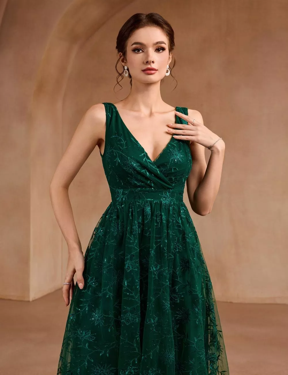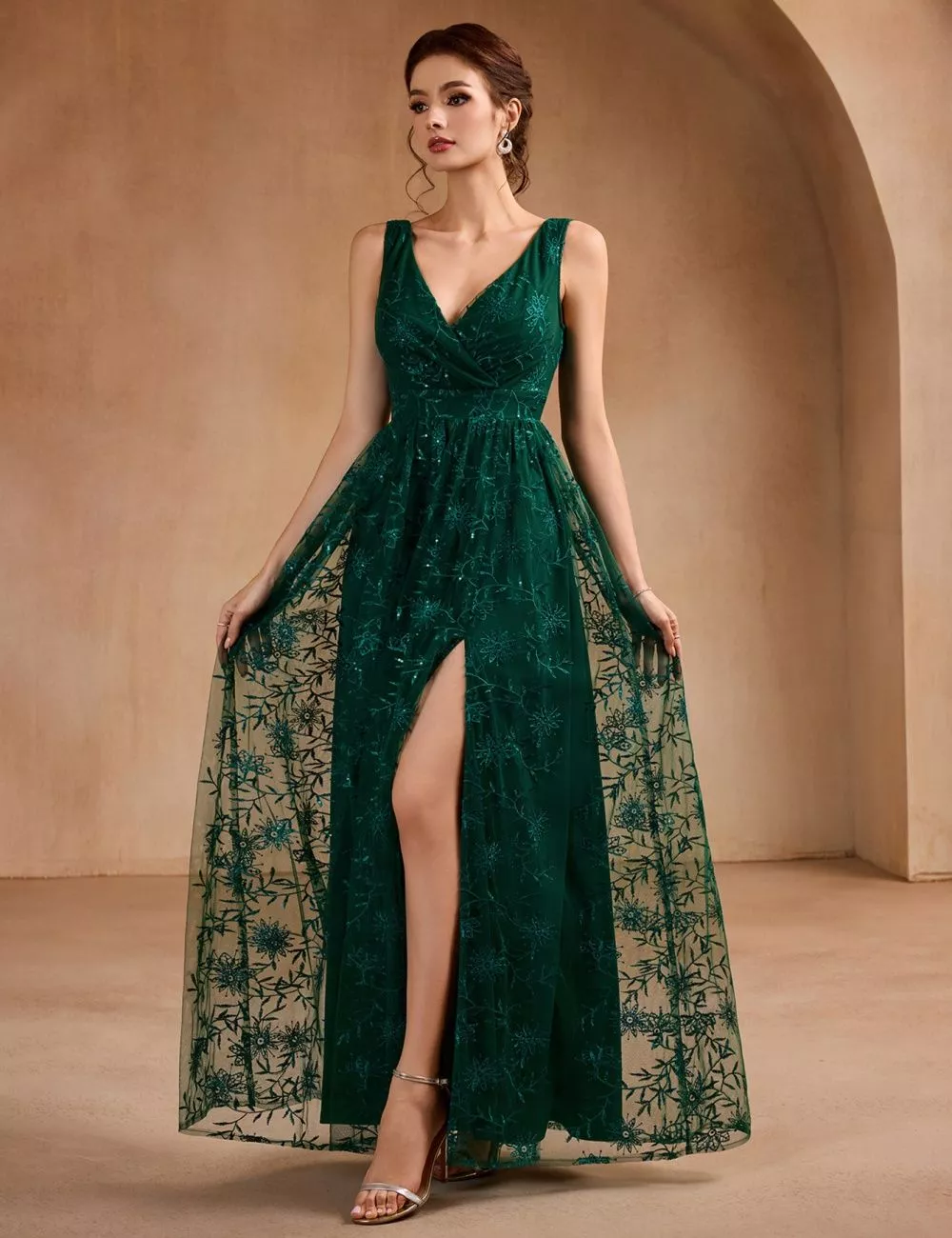 Eleganza e romanticismo si fondono in questo abito lungo verde smeraldo, perfetto per le occasioni più raffinate. Il design valorizza la silhouette con uno scollo a V incrociato e una gonna ampia in tulle ricamato dal fascino delicato. Lo spacco laterale aggiunge una nota sensuale e moderna, rendendolo ideale per cerimonie serali, matrimoni o eventi glamour. I ricami tono su tono donano tridimensionalità al tessuto, creando giochi di luce che impreziosiscono ogni passo. Un abito che conquista con classe e femminilità.