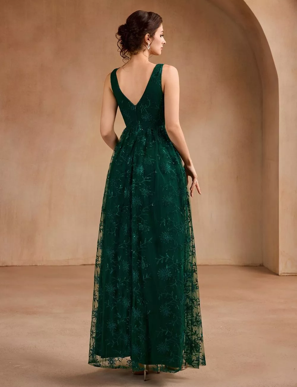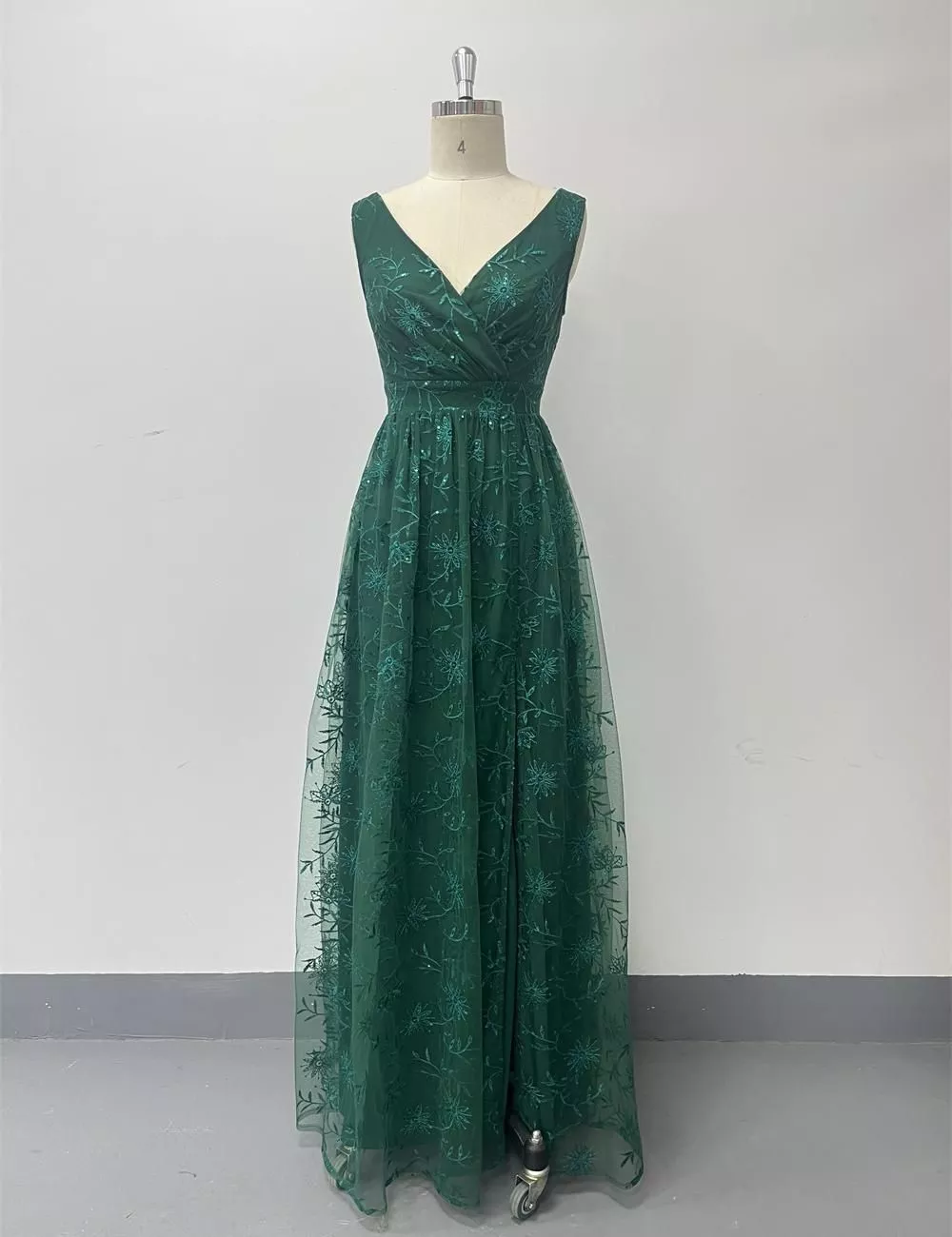 Abito Verde Smeraldo Lungo Con Spacco Elegante Scollo A V E Ricami CF44765