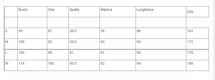 | Busto | Vita | Spalla | Manica | Lunghezza | Orlo | |