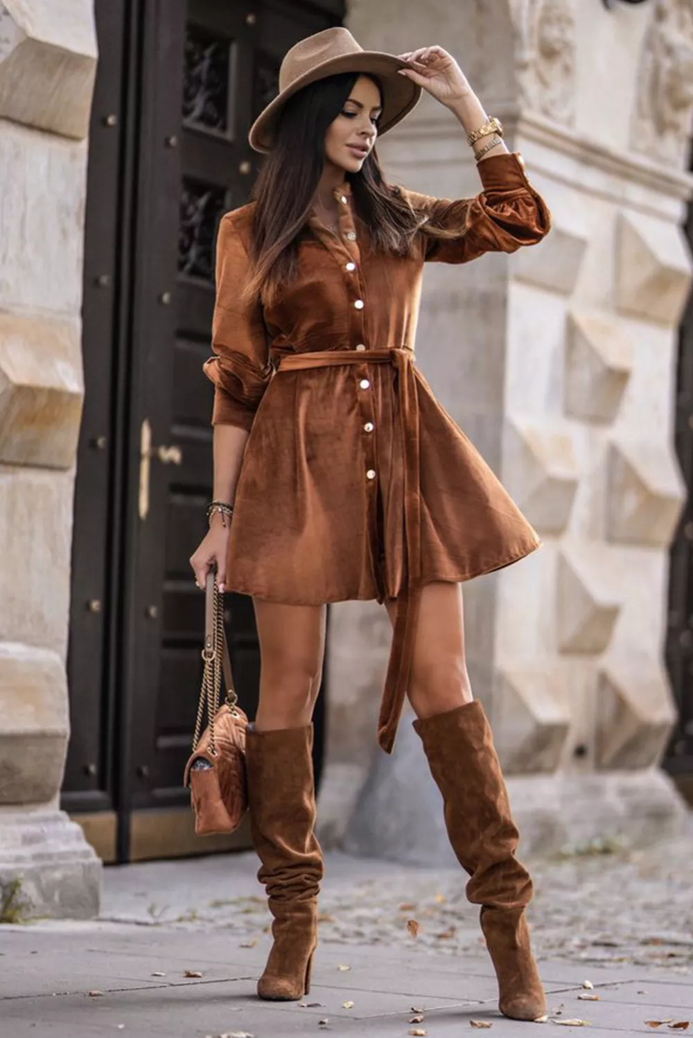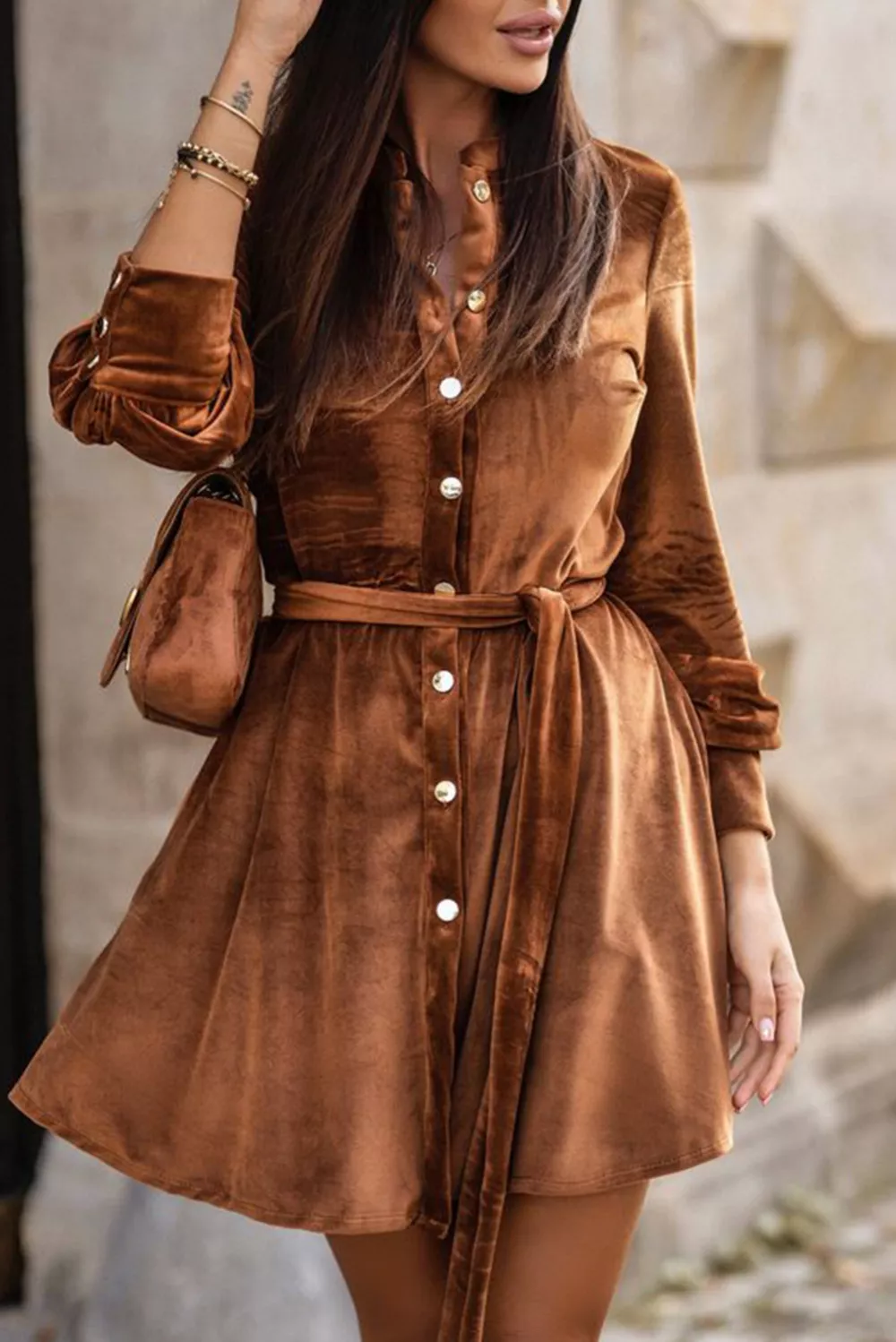 Abito Vestito Donna Corto Morbido Velluto Marrone Con Cintura Manica Lunga 12263