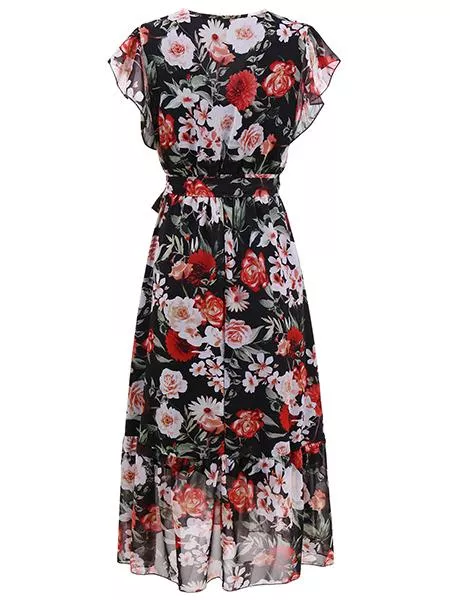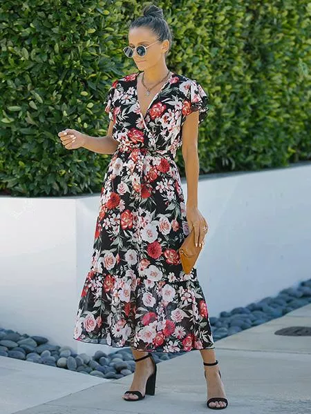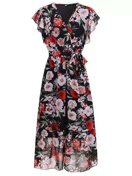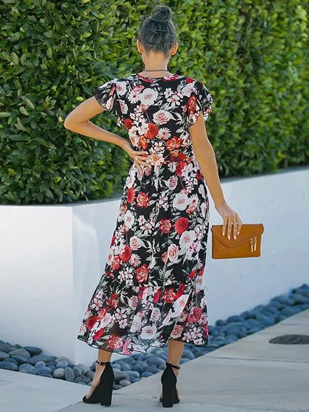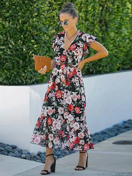 Abito vestito donna lungo smanicato caviglia nero fiori rosso D077