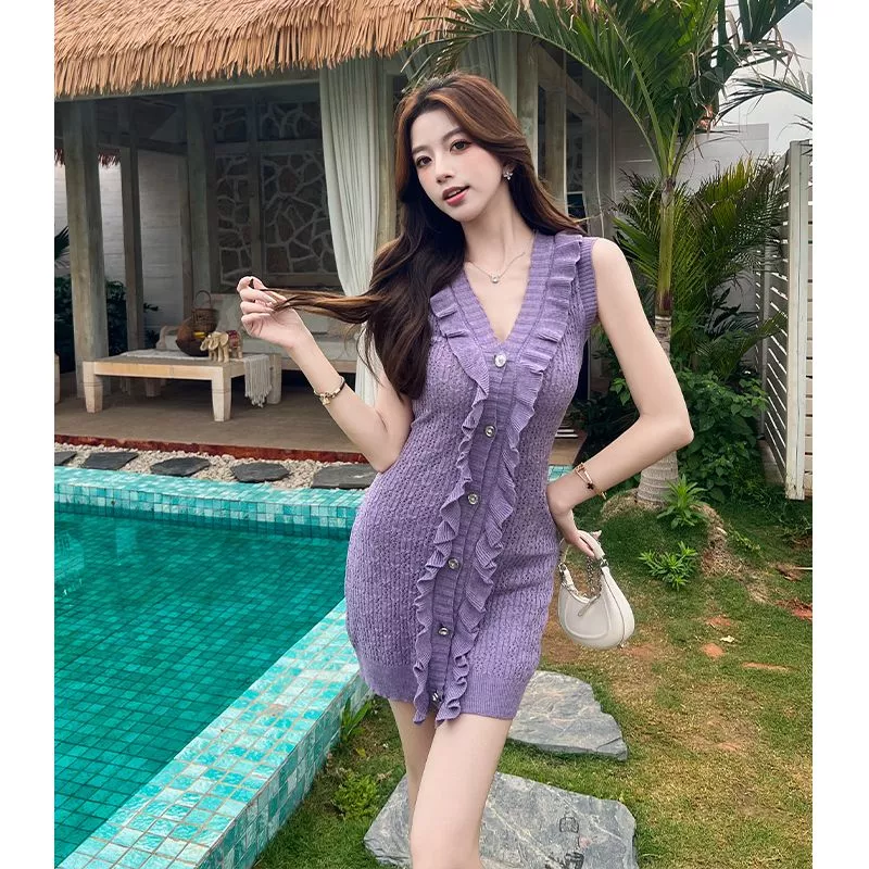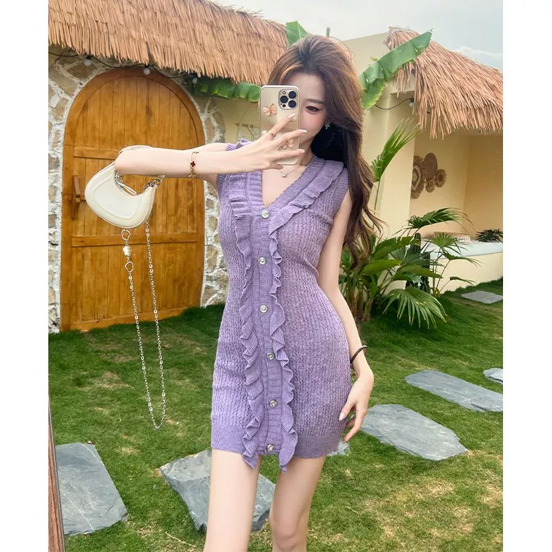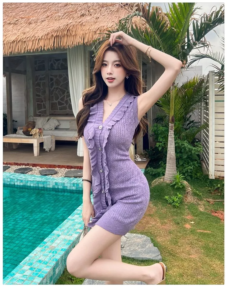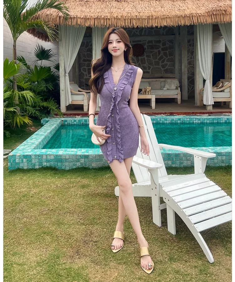 Abito Viola Corto Senza Maniche In Maglia Con Bottoni E Volant Elegante CF42907