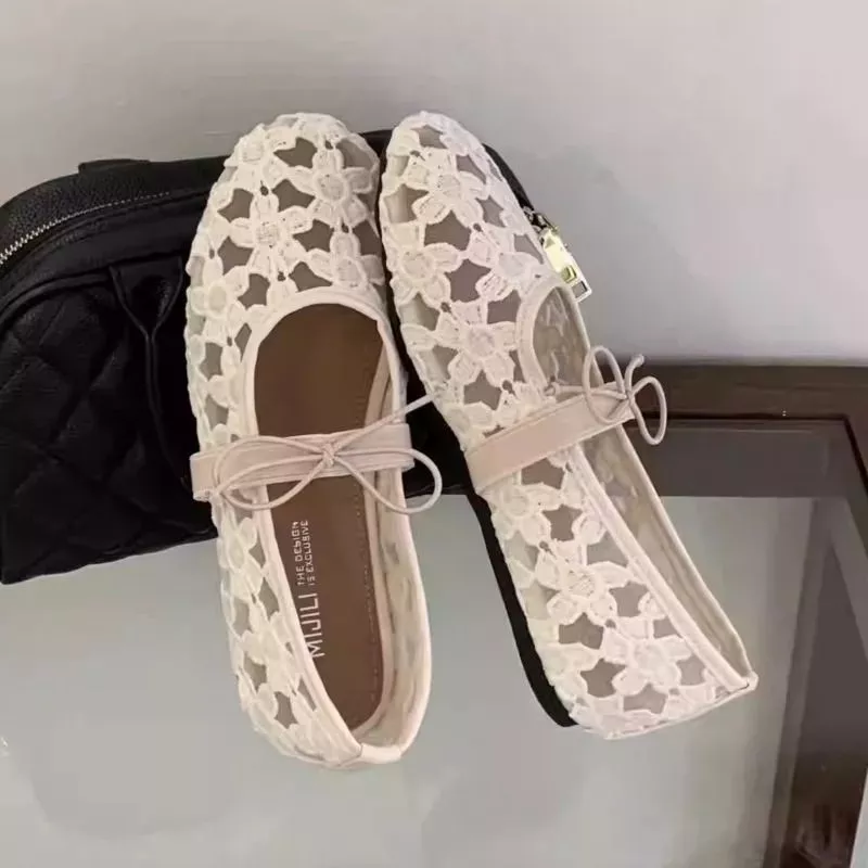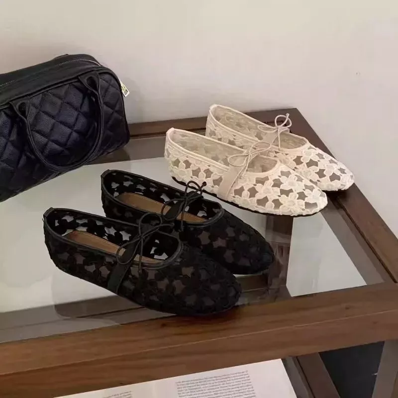 Ballerine basse dal design raffinato e femminile, realizzate in pizzo traforato che crea un effetto leggero e visivamente ricercato. La struttura aperta del materiale permette un look più arioso rispetto alle ballerine classiche, mantenendo comunque una linea elegante e pulita.