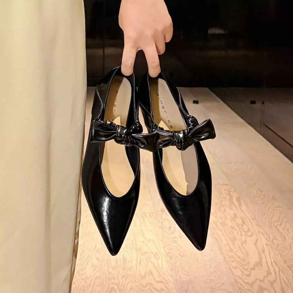 Ballerine eleganti a punta affusolata con cinturino in stile Mary Jane, caratterizzate da un design moderno e raffinato. Il maxi fiocco frontale aggiunge un dettaglio distintivo che valorizza il look con un tocco femminile e di tendenza.