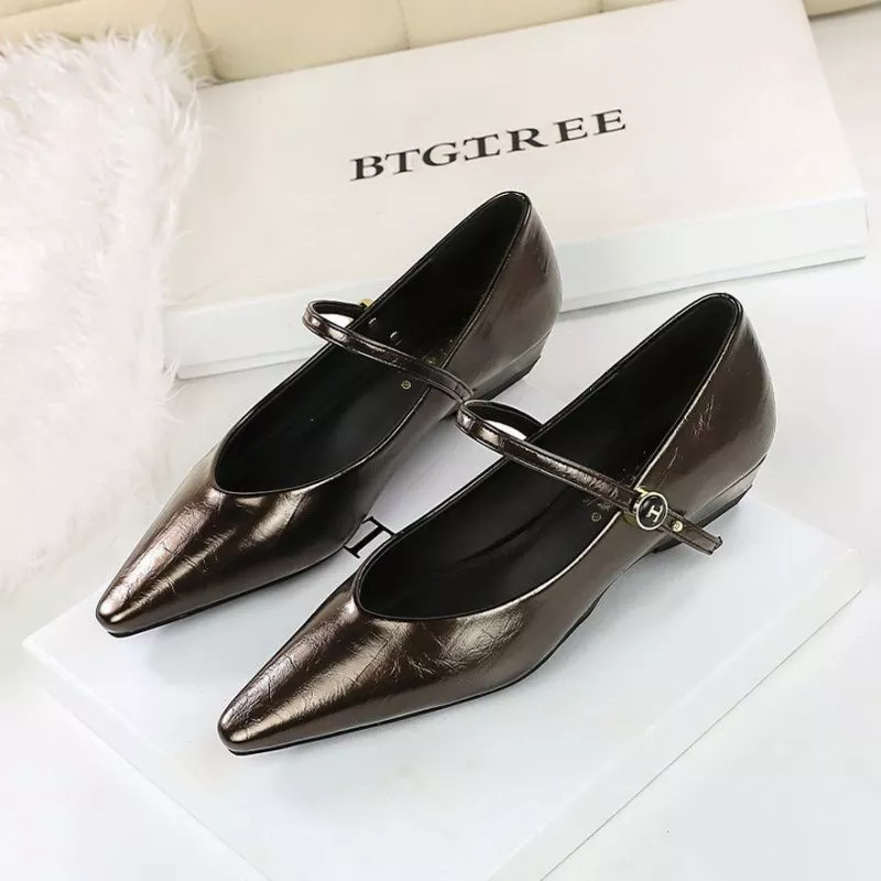 Ballerine eleganti a punta con cinturino sottile e fibbia dorata, perfette per completare look da giorno e da sera.