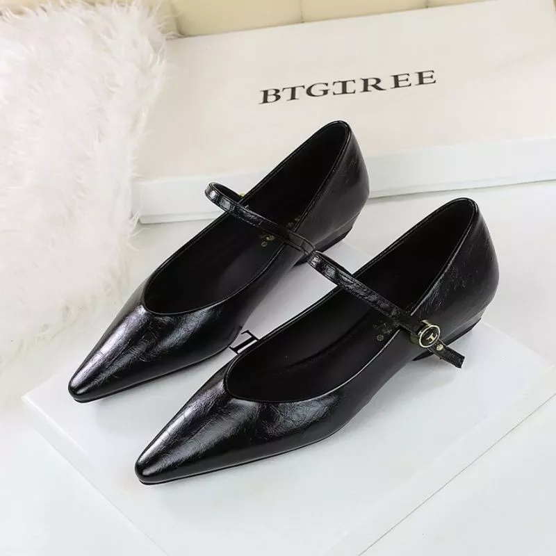 Ballerine eleganti a punta con cinturino sottile e fibbia dorata, perfette per completare look da giorno e da sera.