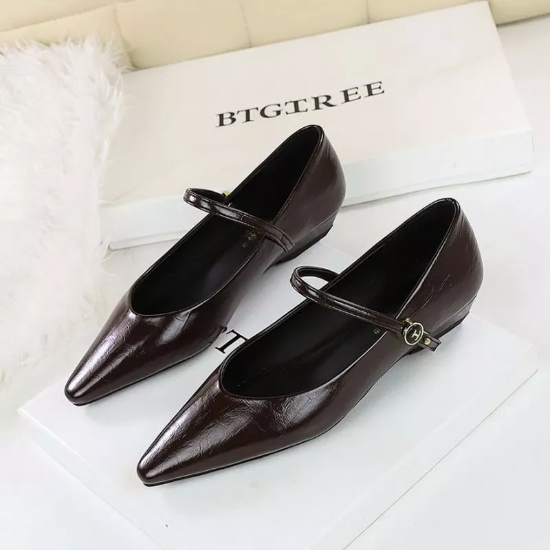 Ballerine eleganti a punta con cinturino sottile e fibbia dorata, perfette per completare look da giorno e da sera.
