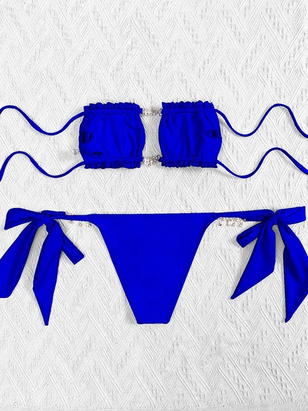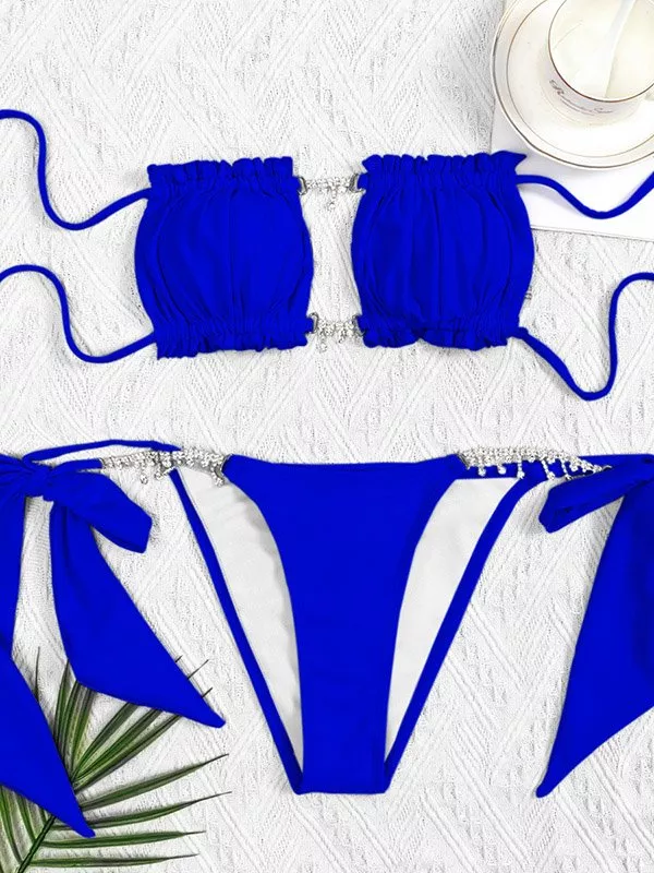 Bikini donna elegante due pezzi slip sgambato fascia blu strass 16231