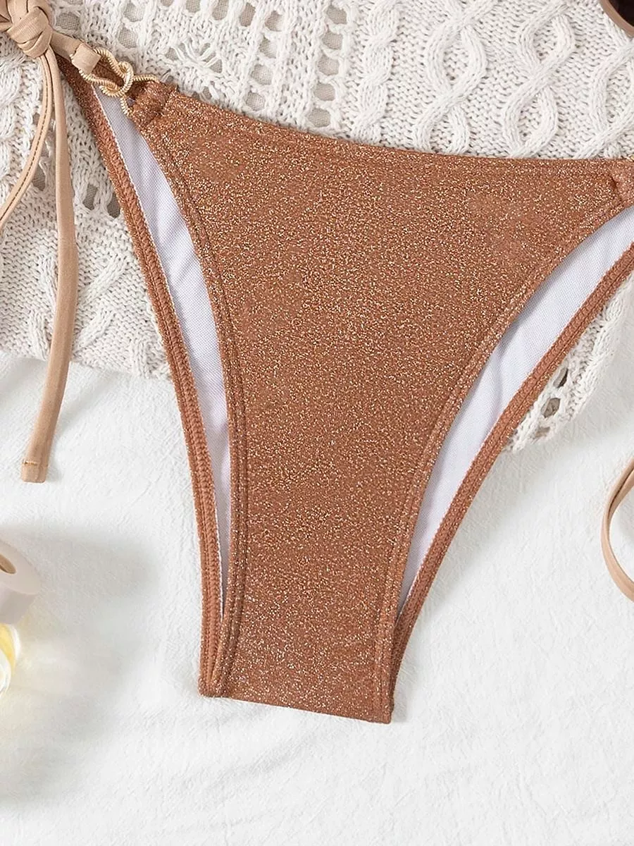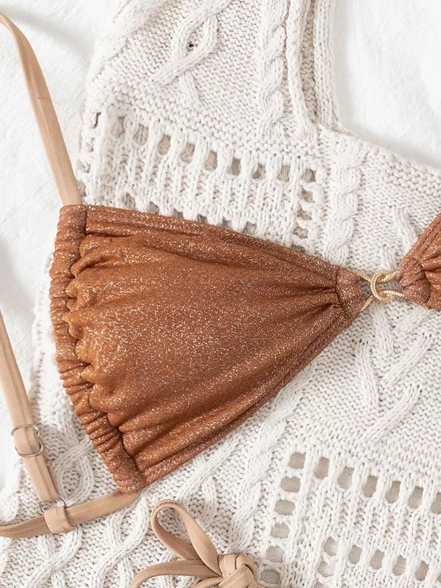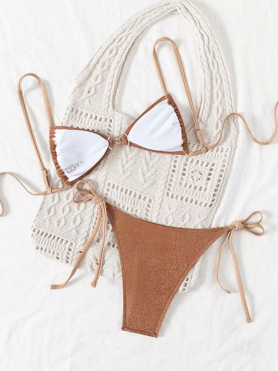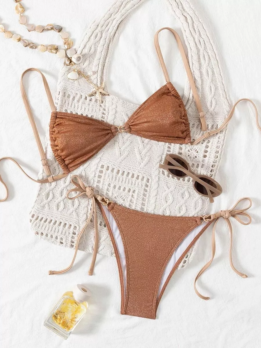 Bikini due pezzi da donna in tinta unita con design minimale e tonalità marrone calda, pensato per un look estivo pulito ed elegante.