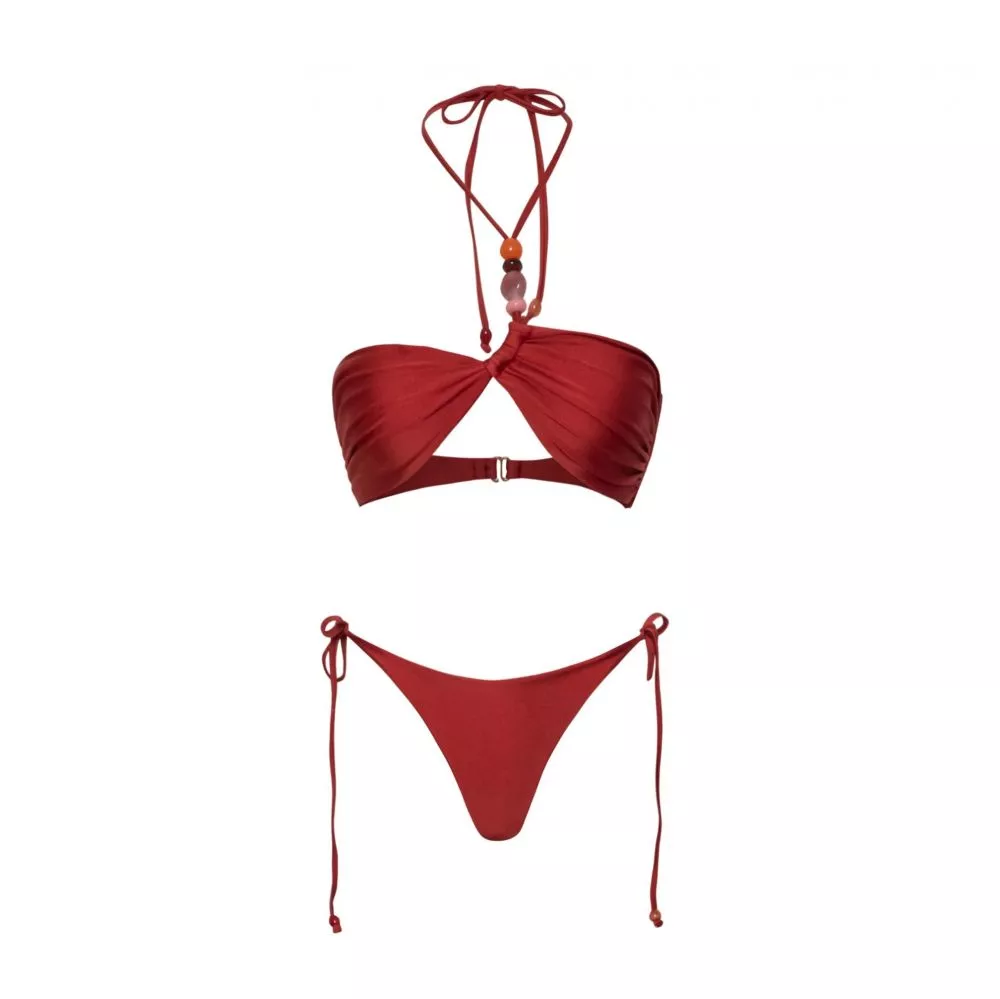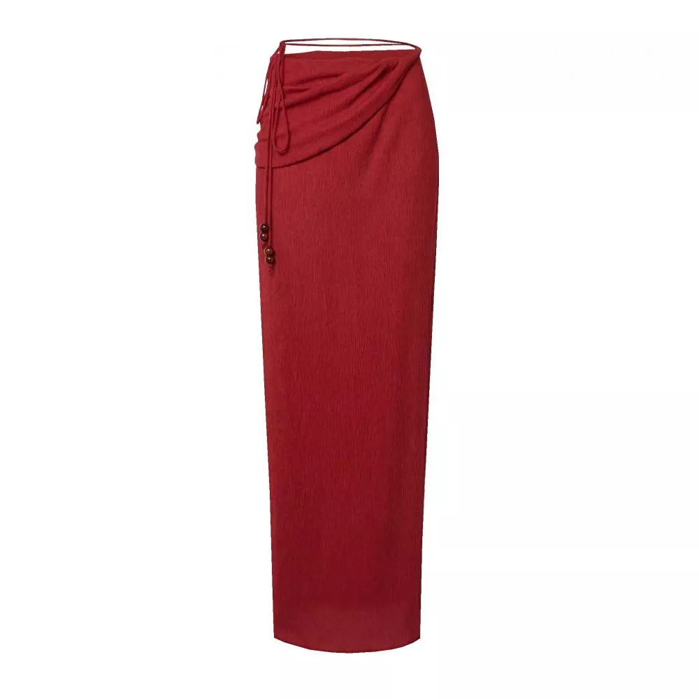 Bikini donna con gonna pareo coordinata caratterizzato da un intenso colore rosso che cattura lo sguardo e crea un look estivo deciso e seducente.
