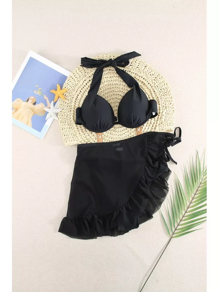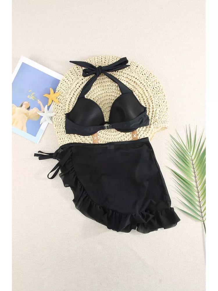 Bikini donna tre pezzi sgambato pareo culottes nero coppe 51876
