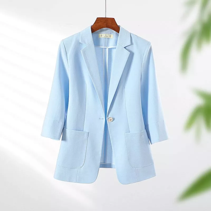 Giacca blazer da donna perfetta per il look business primavera/estate. Il taglio slim fit con mezza manica valorizza la figura donando uno stile elegante e raffinato, ideale sia per l'ufficio che per cerimonie o eventi formali. Il bottone frontale dorato e le tasche anteriori completano il design con un tocco pratico e sofisticato. Facile da abbinare con pantaloni palazzo, gonne o jeans per outfit moderni e versatili. Un capo essenziale per un guardaroba da lavoro sempre alla moda.